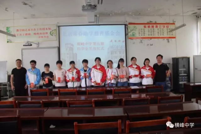 6月4日上午,以“帮助一个贫困学生,改变他的一生”为使命,以“心系寒门学子,共襄助学伟业”为宗旨的北京常春助学慈善基金会横峰中学中学第五期助学金发放仪式在学校报告厅举行,高三年级共10名品学兼优、家境贫寒的学生获得了资助金。横峰中学校长助理、政教处主任王千明主持仪式,横峰中学党总支书记、校长苏万林对受助学生发表热情洋溢的讲话并对受助的10名学生发放资助金。 捐助现场
