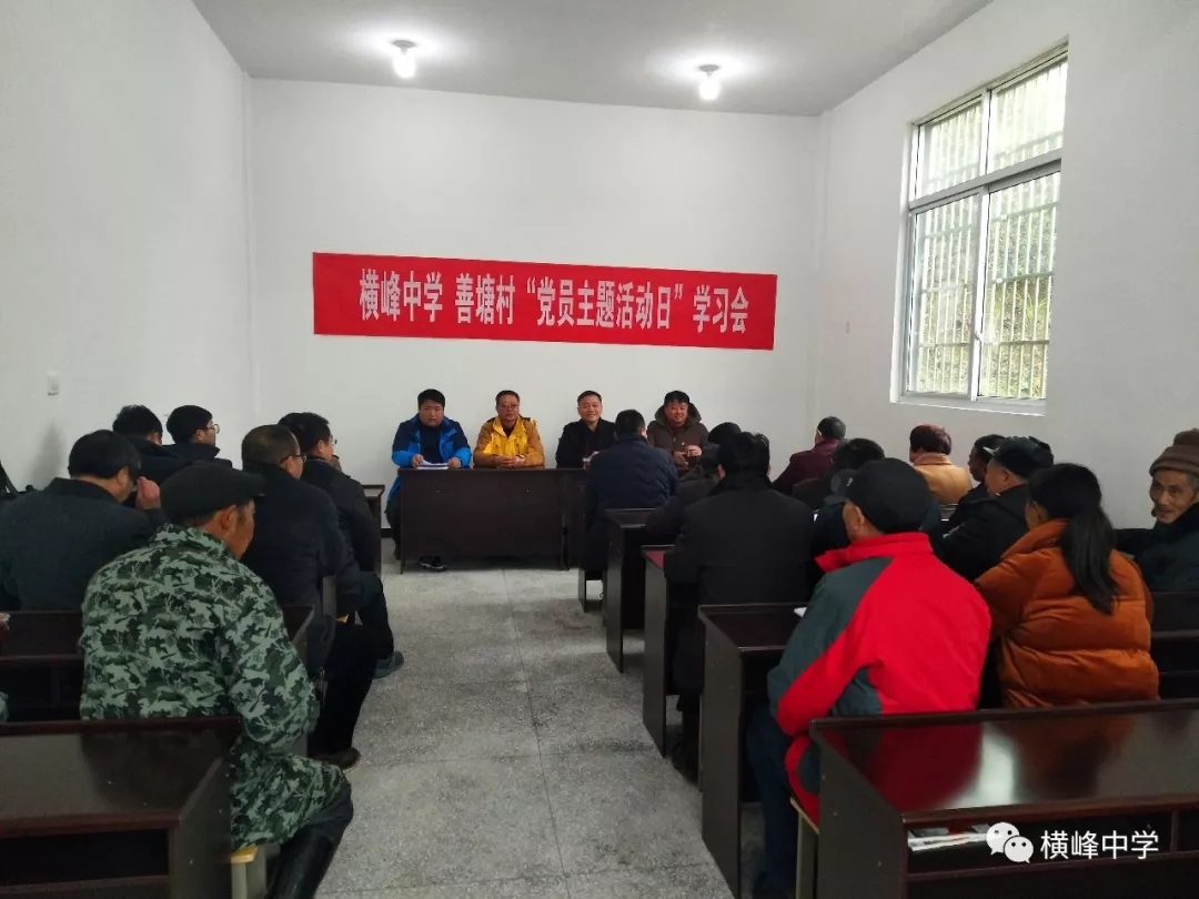 随后,横峰中学党支部联合善塘村党支部开展12月份的“党员主题活动日”活动,在善塘村村书记杨金彬的主持下,与会党员一起重温入党誓词,聆听横峰中学驻善塘村第一书记曹清波给全体党员上的党课——《学习<习近平扶贫论述摘编>内容》,会上还传达学习了以黄群、宋月才、姜开斌同志为代表的抗灾抢险英雄群体和王继才同志的先进事迹以及《中国共产党支部工作条例(试行)》。杨金彬书记随后对《江西省2018年市县党委和政府脱贫攻坚工作成效考核实施方案》和乡党委政府下发的近期任务工作清单进行细化解读。会议最后,横峰中学党总支书记、校长苏万林就以上工作作总结发言,他提出三大任务和要求:1.积极主动作为,摒弃拖延症,争优创先;2.按照时间节点,任务分工安排到责任人;3.严格遵守作风建设,认真查摆,全力迎考。会后,各帮扶干部上户走访贫困户,填写扶贫工作日档案卡,与贫困户进一步沟通提高认可度,认真落实扶贫工作日各项工作。