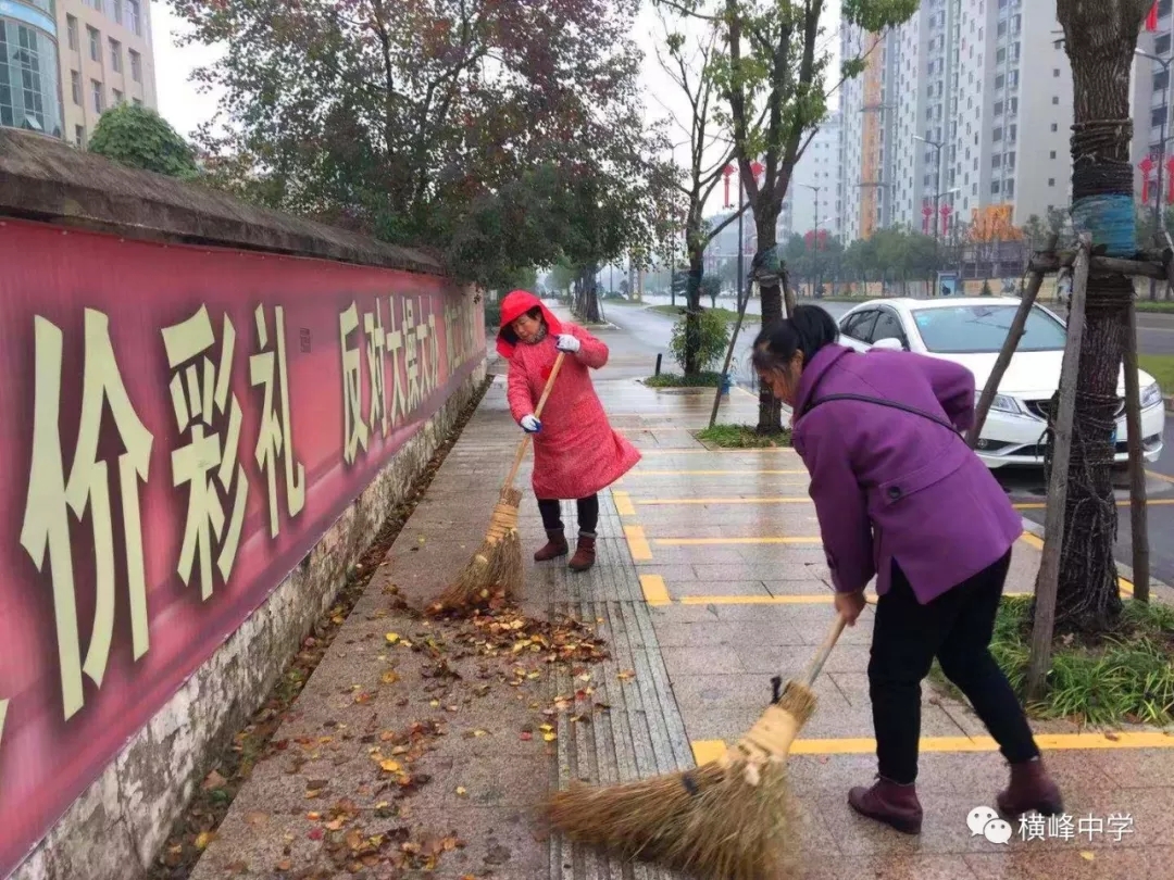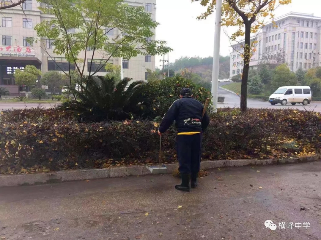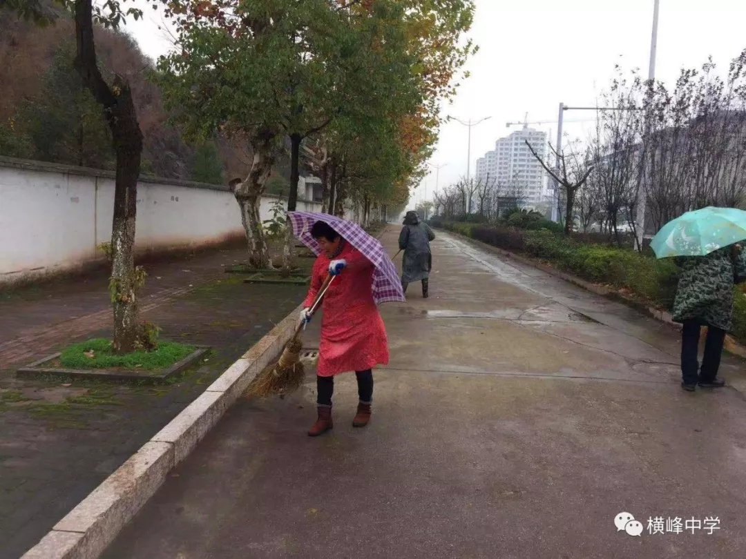 绵绵细雨难阻止奋斗激情,14日下午,横峰中学的后勤人员来到学校责任区域打扫卫生,撑着雨伞、顶着帽子,他们无惧风雨和严寒,将责任区的每个角落都打扫的干干净净,为横峰县“双创”活动绘出靓丽的一笔。