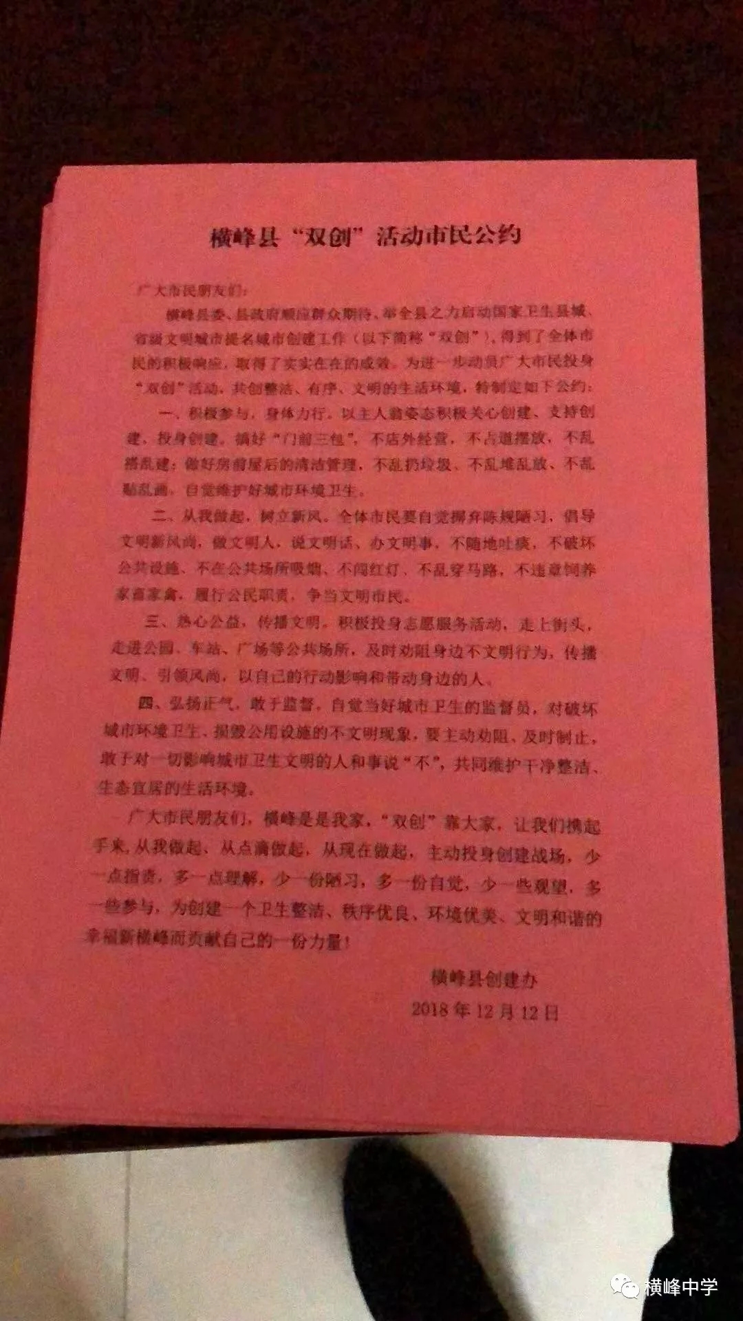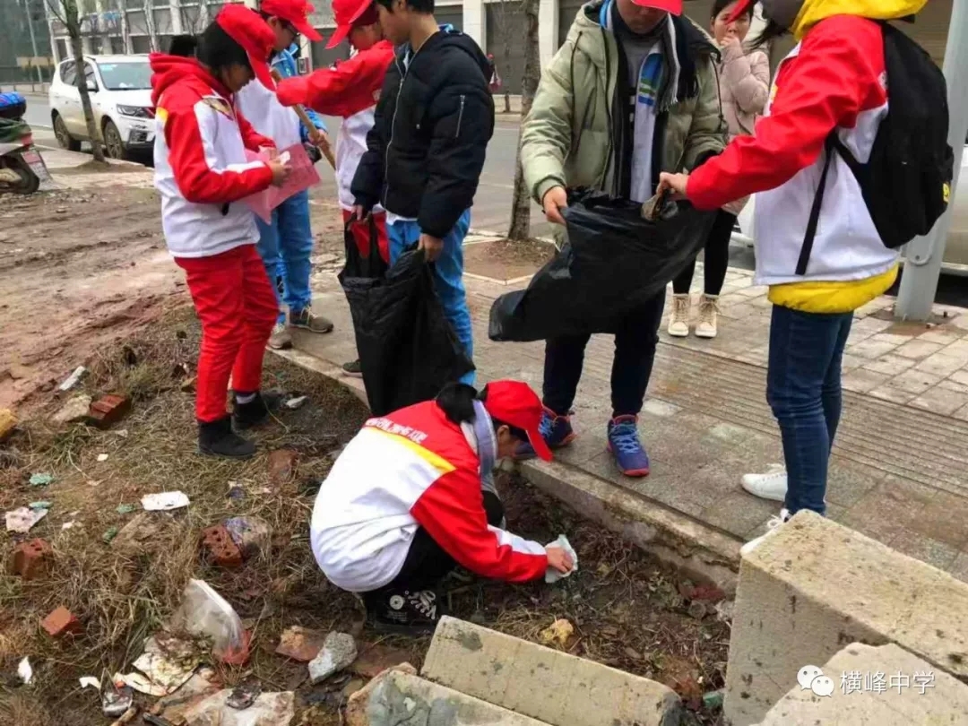 在后勤人员辛苦地打扫卫生的同时,刚刚考完试的横峰中学志愿者协会的同学们正用“小手牵大手”的形式,一边投身于“双创”活动卫生打扫,一边发放市民公约,用微笑感染并劝导社会人士投身于“双创”工作中,树文明新风。