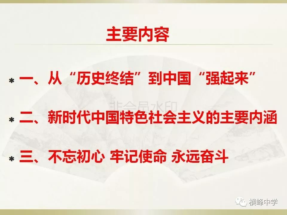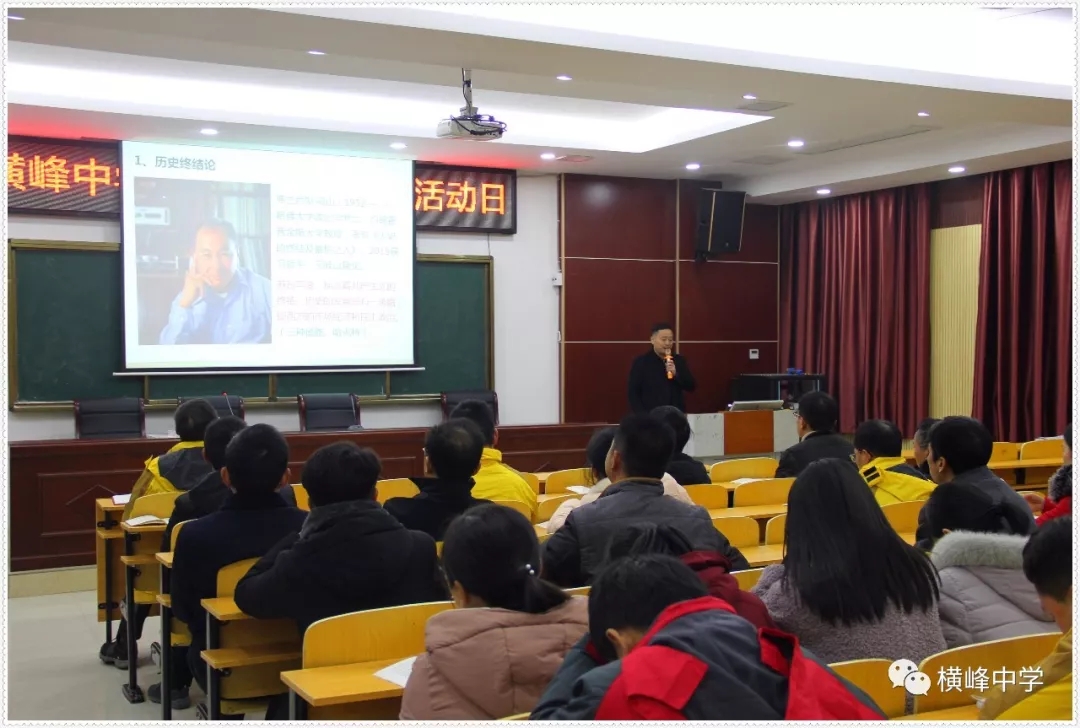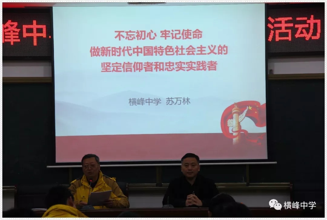 随后,横峰中学党总支书记苏万林为与会党员教师上了一堂名为《不忘初心 牢记使命 做新时代中国特色社会主义的坚定信仰者和忠实实践者》的生动党课。在这堂党课上,苏书记以中美贸易战、华为孟晚舟遭拘留等热点事件为切入点,为大家分析了近年来不断涌现的唱衰中国的“历史终结”理论及其崩溃的现实。结合详实的数据和图片等资料,他讲解了中国崛起过程中面临的外部危机,展示中国的灵活外交政策和近年来的快速发展态势,着重分析了新时代中国特色社会主义的主要内涵。“事虽难,做则成,路虽远,性则至”,党课最后,他要求全体党员教师要不忘初心牢记使命永远奋斗。 |