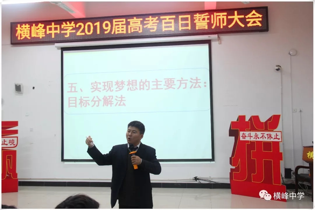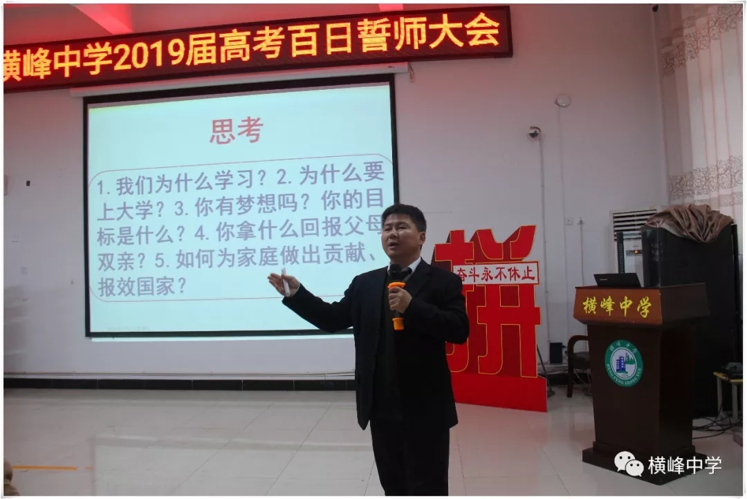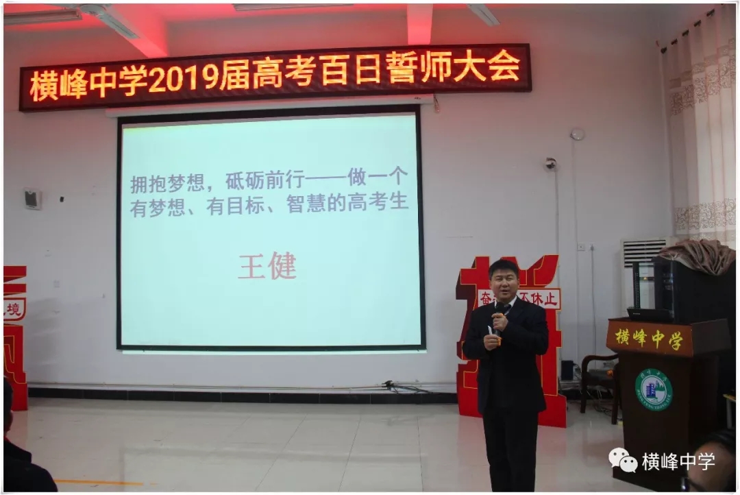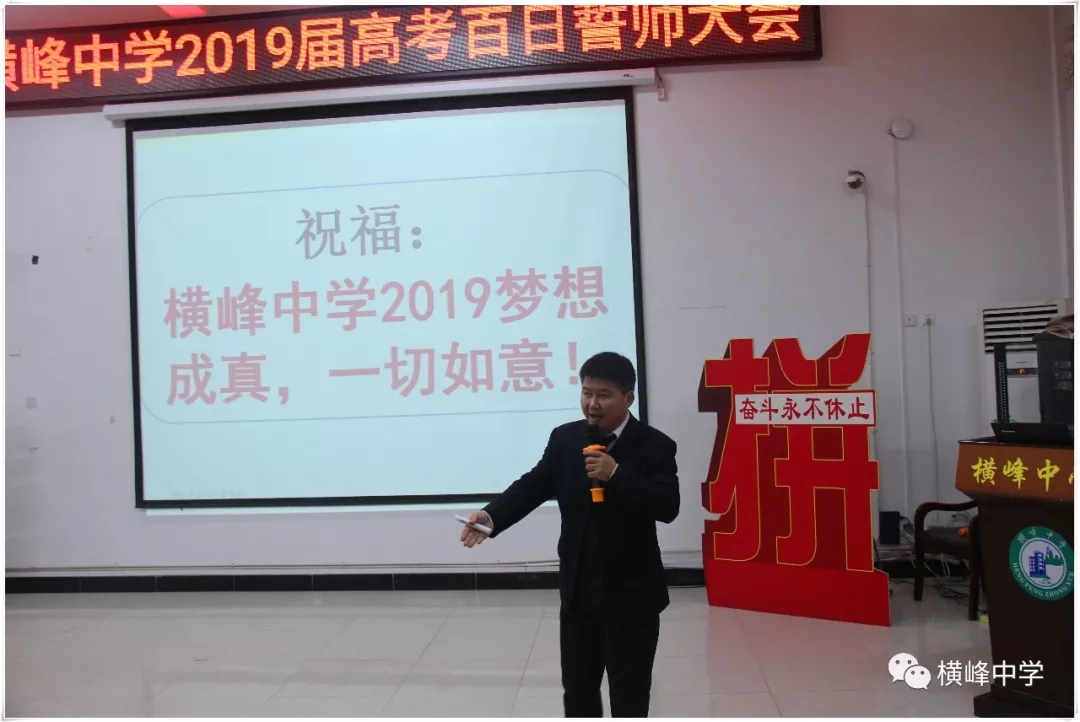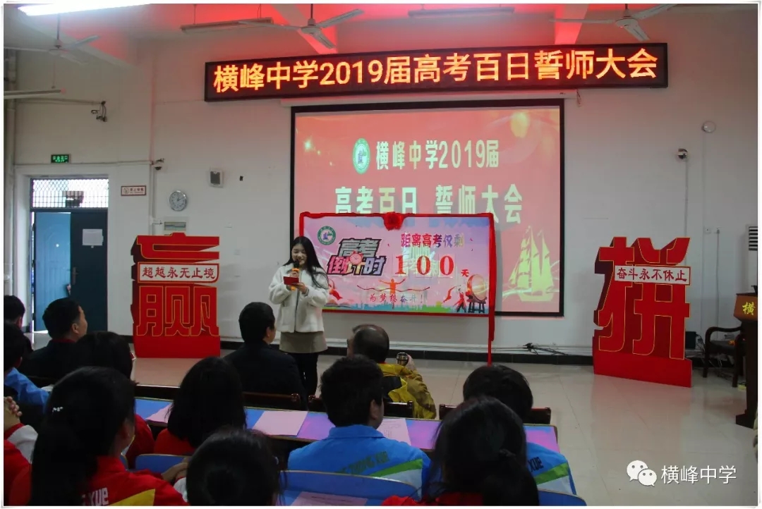 横看成岭侧成峰 , 横峰中学再起峰 。 数千战友齐聚会 , 此生不奋待何生。 ——王健 逐梦高考,无问西东。 砥砺争先,不负青春。 一九高考,谁与争锋。 英雄少年,唯我横中。 冲刺百天,着力巅峰。 决战百天,我必成功! ——横峰中学百日冲刺誓词 历经十几年寒窗苦读的高三学子们已经走完了四千多个日日夜夜,现在,至关紧要的100天冲刺就在眼前。3月1日下午,我校高三师生集结在校艺术楼阶梯教室,共同见证高考倒计时100天。