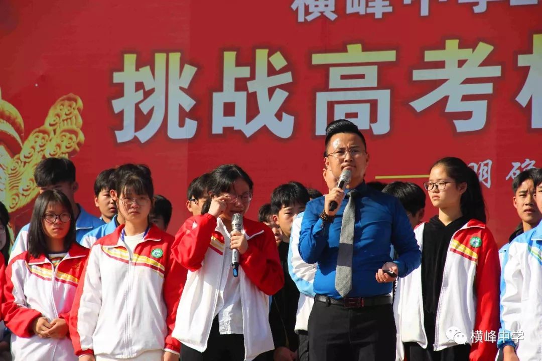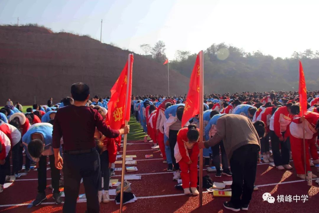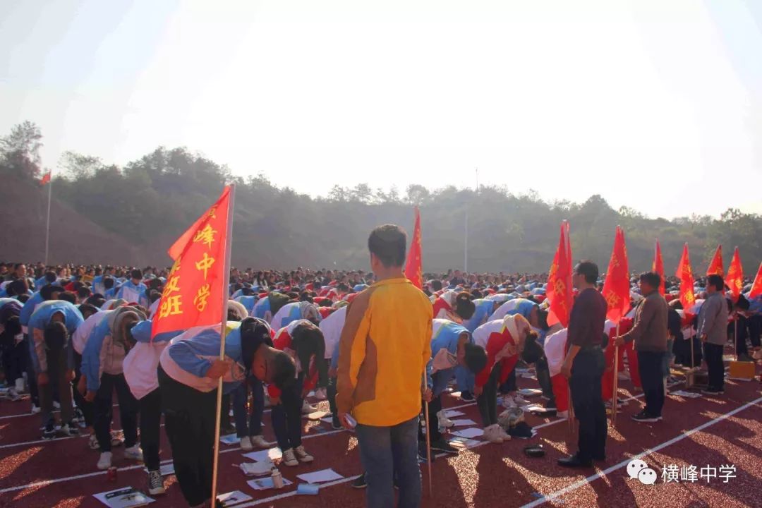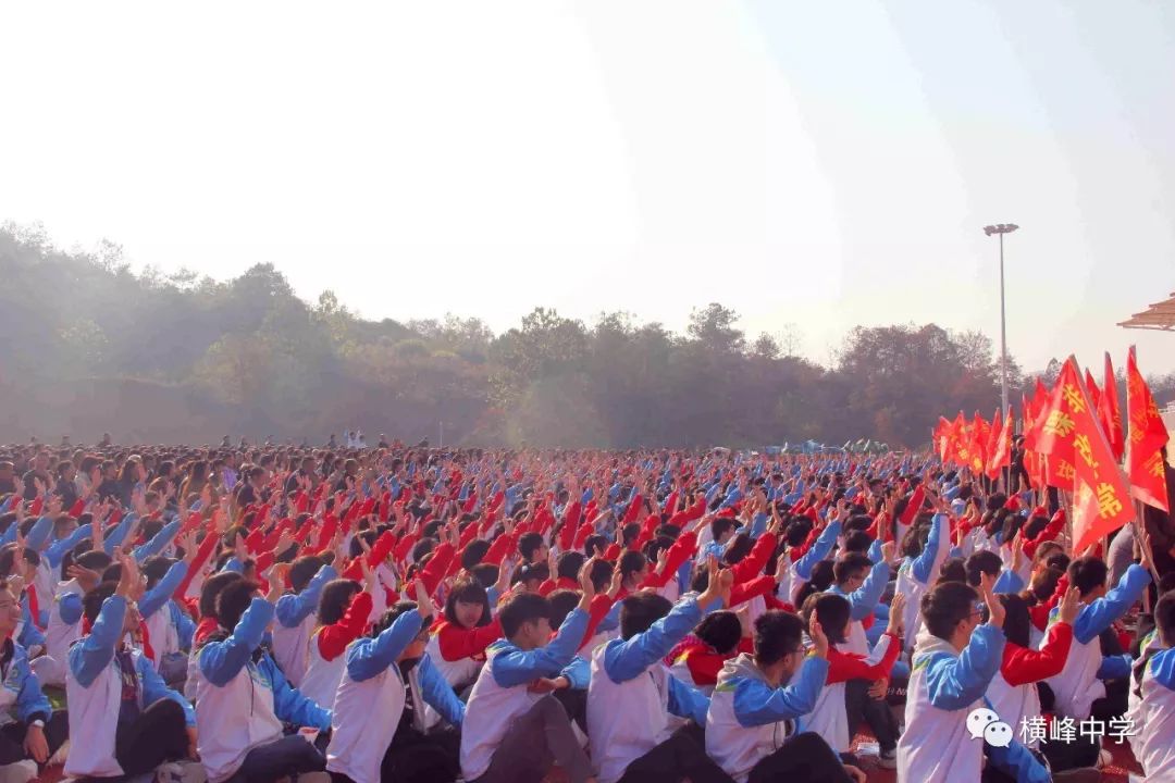 誓言 许诺未来 十八位班级代表高举班旗绕场奔跑,坚定有力的步伐一往无前。擂擂战鼓震耳欲聋,铮铮誓言响彻云霄,且看我横中学子,明年六月雄霸高考风云榜! “我宣誓:奋战三年,不留遗憾,我行,我一定行,高考必胜,青春必胜,我们必胜,全力以赴,不负青春,不负父母,考上大学,回报父母,回报母校,我们能行!”全体高三学子用响彻云霄的铮铮誓言、用坚定的神情展现了决战高考的勇气和斗志。