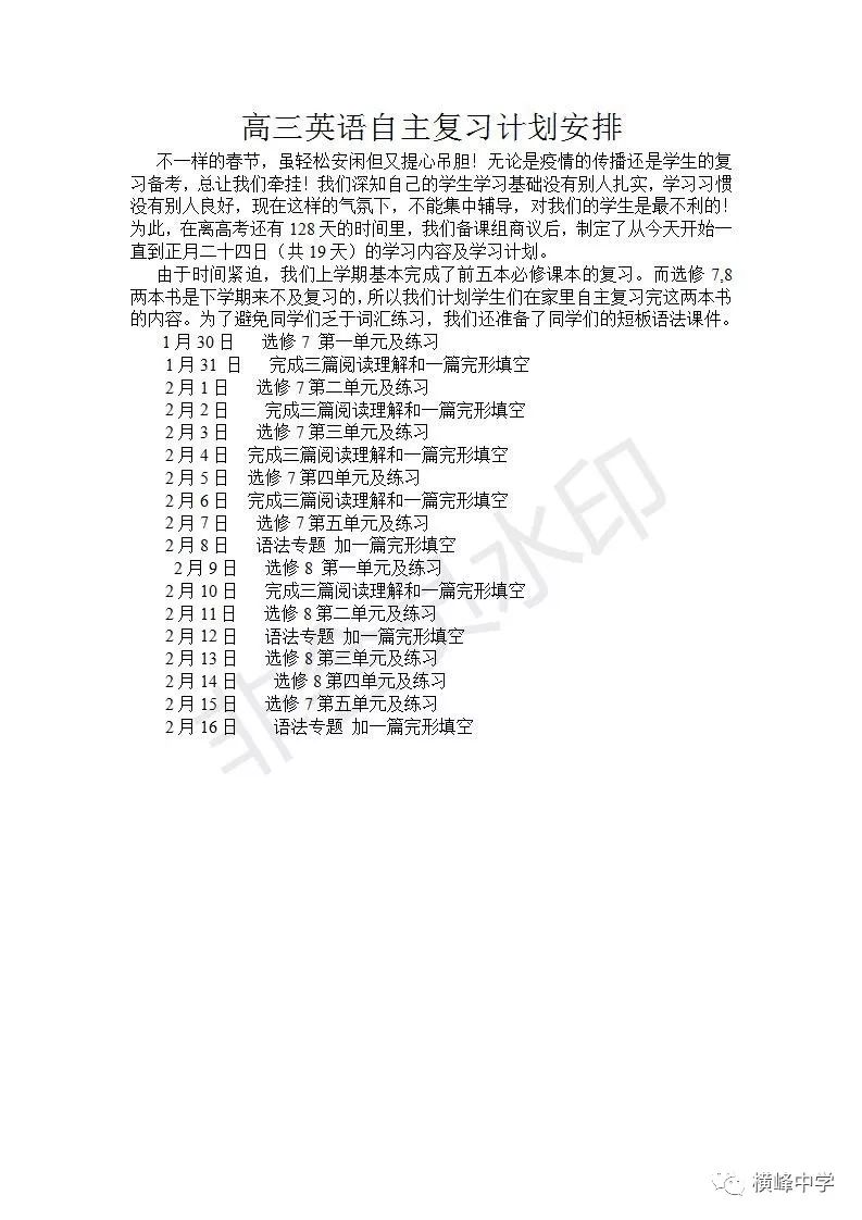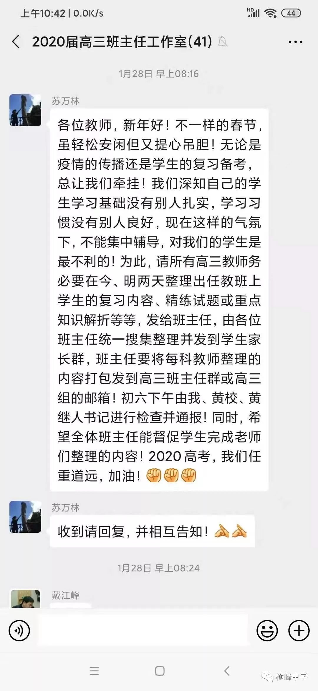 面对突如其来的新型冠状病毒感染的肺炎疫情,横峰中学自接到关于延期开学的通知后,迅速行动,做好延期开学期间学生远程学习教育服务工作,通过网络研讨调度等方式,时刻关注班级群动向,宣传相关疏导知识,加强健康生活指导,指导学生按时参加在线学习,认真完成及时上传老师布置的作业。