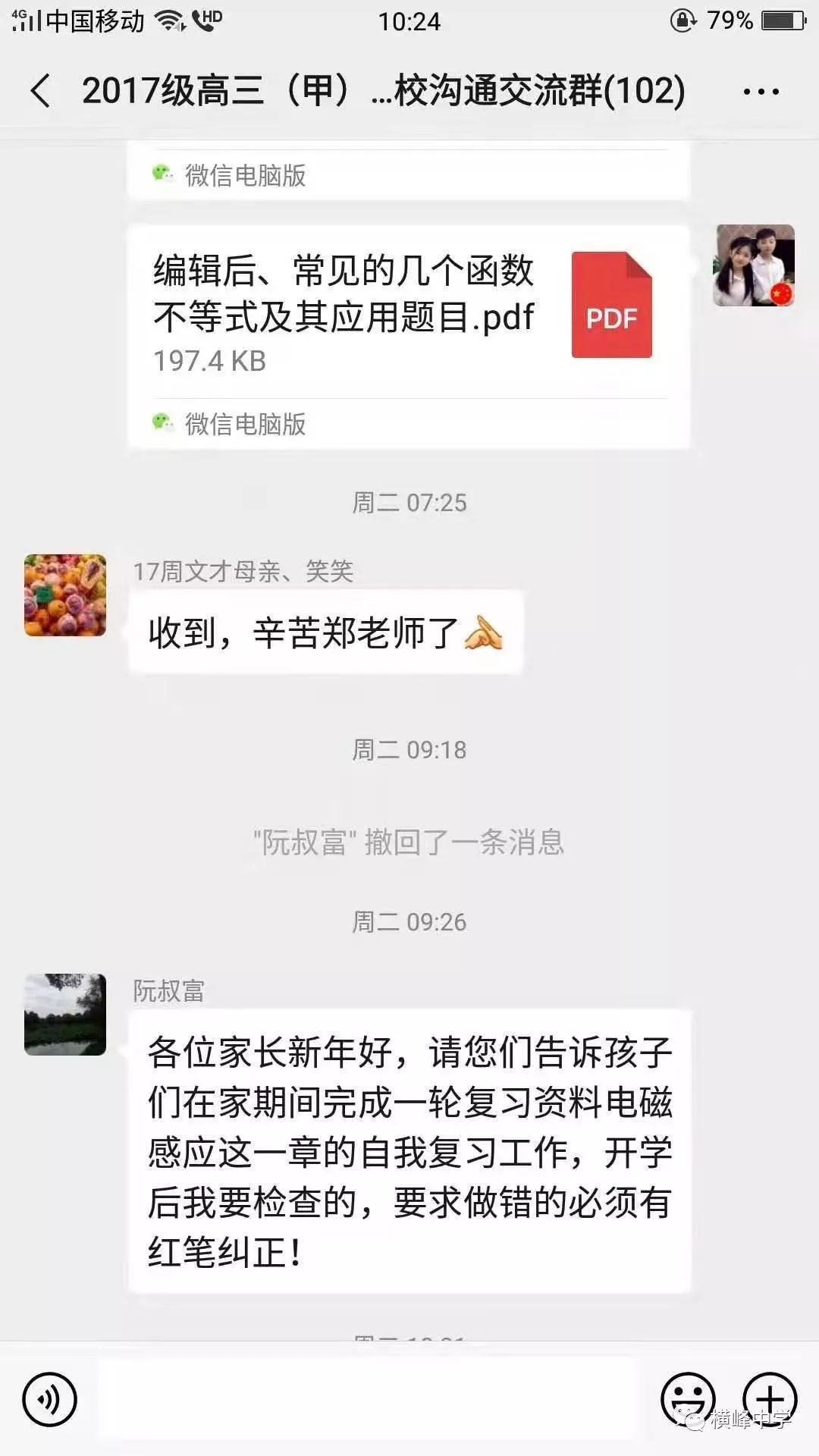 各科备课组分工编制延期开学期间的教学资料,有单元及课时学习目标、重点难点、问题学习过程、训练题组及相应达标检测试题,做到目标引领,学练结合,学评一致。任课教师立足学科特点,采取视频连线、远程批改的方式,每天通过班级群布置预习任务及预习检测题。学生根据要求完成每天的学习任务,同时在家长的帮助下将每天的学习情况拍照上传至班级群,各位任课老师利用班级群检查学生的学习效果,并提供答疑服务。 疫情无法阻挡学习的热情,学校与家长携手,通过家校微信群等各种途径,联防联控,创新教学,组织指导,让学生停课期间做好防护的同时,仍能保持良好的学习状态,感受学习的快乐,真正做到“停课不停学”,真正实现家校“零距离”对接,待到春暖花开日,万象更新,旧疾当愈,常乐常安! |