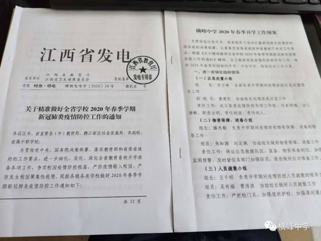 集中学习教育部、江西省教育厅下发的文件 为贯彻落实上级部门文件精神,扎实做好我校新冠肺炎疫情防控工作和开学准备工作,与会人员集中学习了江西省教育厅下发的《关于精准做好全省学校2020年春季学期新冠肺炎疫情防控工作的通知》等文件,详细研讨了《横峰中学2020年春季开学工作预案》,成立了以苏万林校长为组长的开学准备工作领导小组,并进一步成立了由各校领导分别负责的应急处置、物资保障、消毒、人员疏散、联防联控、心理疏导、行为教育、宣传报道、组织纪律检查八个工作小组,对开学前后的开学准备工作、人员防控、线上教学、安全德育教育、食堂监管、住宿学生管理、卫生管理、防控措施、关心关爱等各项工作进行了详细规划。