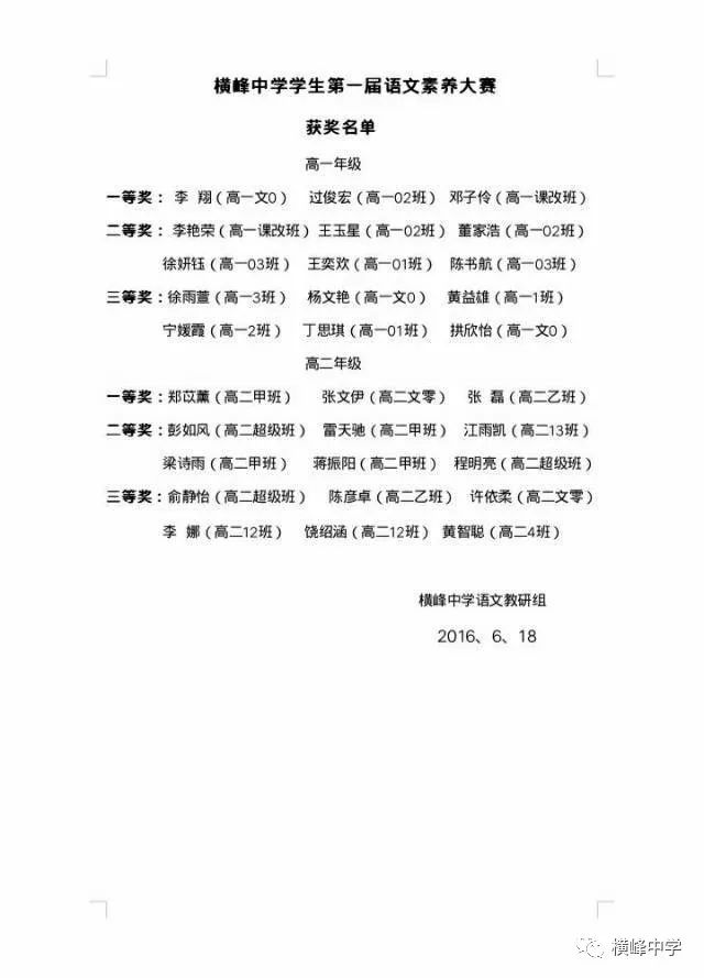 6月15日下午班会课时间,我校高一和高二年级的部分同学参加了首届语文素养大赛。为了更好地探索提高学生们语文素养的教育方法,更好地激发学生们的语文学习兴趣,更好地挖掘他们语文素养的潜力,横峰中学语文的老师们精心筹备了本次竞赛。