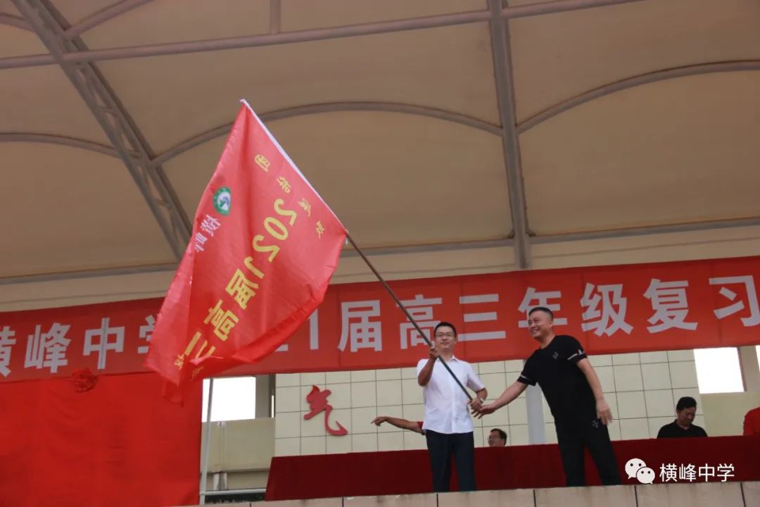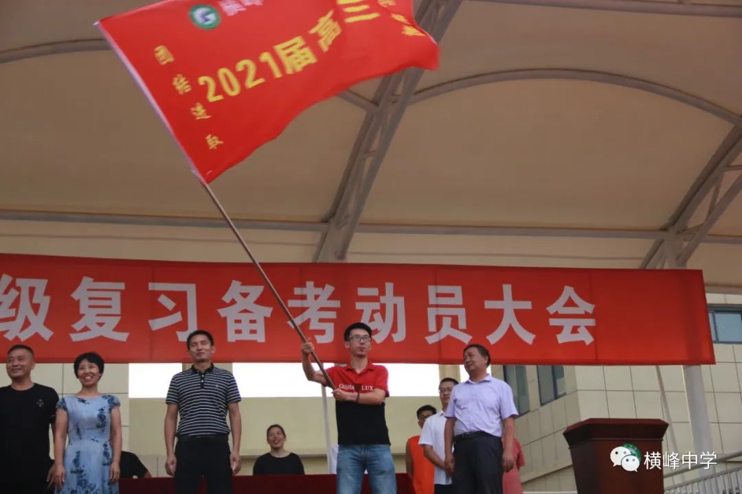 出征的号角已经吹响,猎猎的战旗正迎风飘扬。在最激动人心的授旗仪式环节,苏万林校长从2020届高三蹲点副校长黄爱民手中接过新高三年级旗,庄重地交给2021届高三年级蹲点校级班子侯弋峰,随后,全体高三班主任轮流舞动高三年级旗,见证新高三年级揭牌仪式。