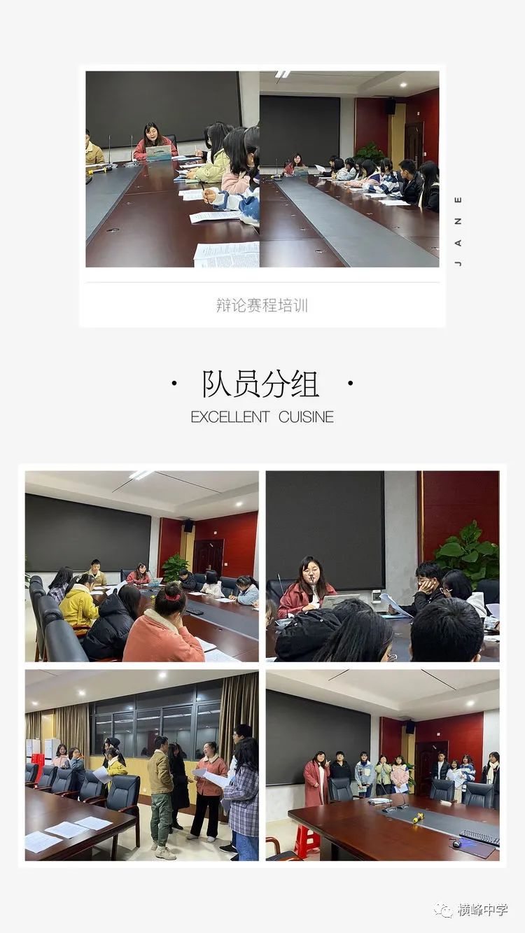针对选手们的个人特点,指导老师们对他们进行分组,并对于辩论赛的流程给各组都做了详细的培训。 在此特别感谢高二语文备课组罗甜老师和高二历史备课组郑时荣老师,二位都曾经是非常优秀的辩手。不免感慨,我们横中的青年教师真是才华横溢! 决赛如期举行,同学们在指导老师的指导下做了充分的准备,我们期待已久!