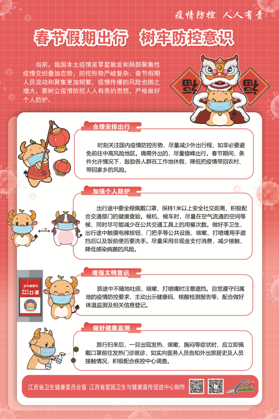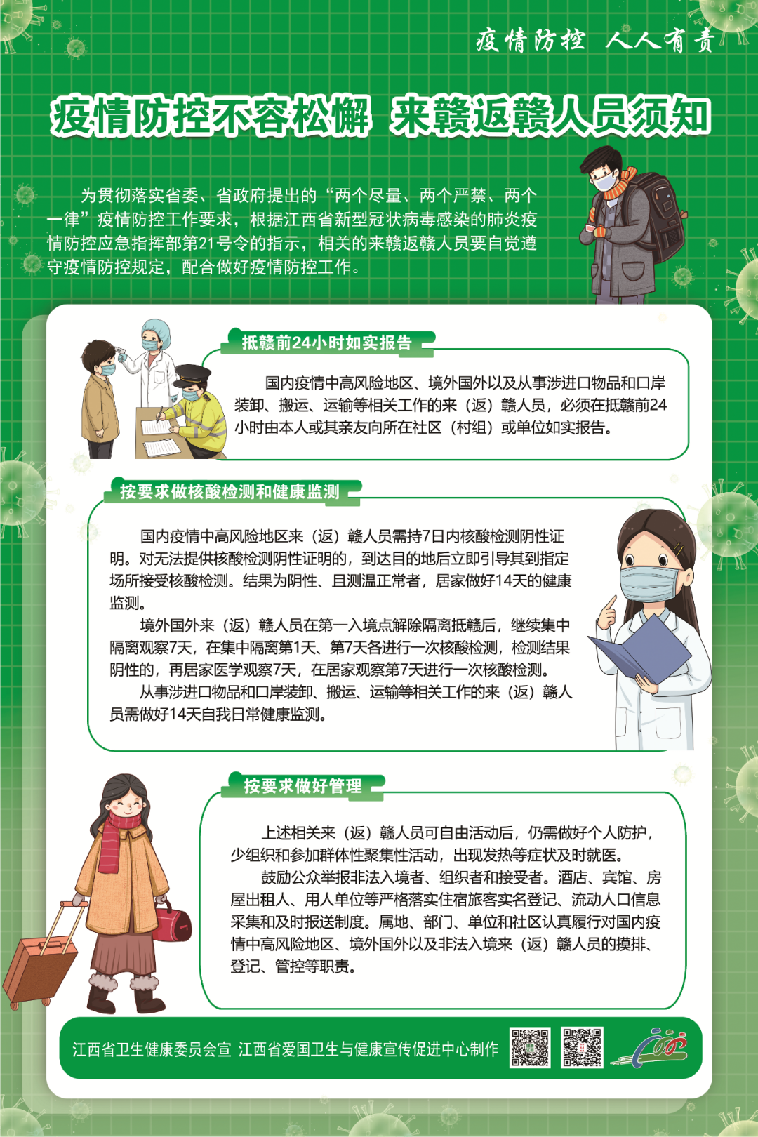 一、提高疫情防控意识 疫情防控“常态化”不等于“正常化”,“低风险”不等于“零风险”,“有序流动”不等于“自由行动”。家长朋友和全体师生必须时刻绷紧疫情防控这根弦,坚决克服麻痹思想、侥幸心理、松劲心态;要秉持科学态度,坚持人物同防、多病共防,关注官方通报和权威播报,了解疫情防控相关信息,学习健康防病知识,提高自我防护能力,不信谣、不传谣、不造谣;确保校园疫情常态化防控工作顺利开展。 二、落实每日健康监测 学生每天上学前要在家中测量体温,出现体温37.3℃及以上、腹泻、呕吐等异常症状,请在家休息,并及时就医,同时将情况上报班主任,待症状体征消失、身体痊愈后返校上课。不带病上课,不隐瞒、不谎报病情。上学期间,学生监护人手机须保持畅通。如师生入校体温异常,学校将会按照疫情防控入校程序执行。 三、减少非必要外出 大家要自觉控制活动范围,坚持“非必要不外出”原则,减少社会活动,不前往疫情中高风险区域。师生如因必要原因离开横峰要向学校申报,返横后要提供防疫行程记录,经学校批准后方可返校。
