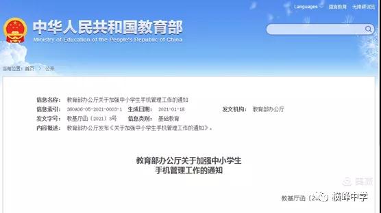 各省、自治区、直辖市教育厅(教委),新疆生产建设兵团教育局: 随着手机的日益普及,学生使用手机对学校管理和学生发展带来诸多不利影响。为保护学生视力,让学生在学校专心学习,防止沉迷网络和游戏,促进学生身心健康发展,现就进一步加强中小学生手机管理工作通知如下。 一、有限带入校园。学校应当告知学生和家长,原则上不得将个人手机带入校园。学生确有将手机带入校园需求的,须经学生家长同意、书面提出申请,进校后应将手机交由学校统一保管,禁止带入课堂。 二、细化管理措施。学校应将手机管理纳入学校日常管理,制定具体办法,明确统一保管的场所、方式、责任人,提供必要保管装置。应通过设立校内公共电话、建立班主任沟通热线、探索使用具备通话功能的电子学生证或提供其他家长便捷联系学生的途径等措施,解决学生与家长通话需求。加强课堂教学和作业管理,不得用手机布置作业或要求学生利用手机完成作业。 三、加强教育引导。学校要通过国旗下讲话、班团队会、心理辅导、校规校纪等多种形式加强教育引导,让学生科学理性对待并合理使用手机,提高学生信息素养和自我管理能力,避免简单粗暴管理行为。 四、做好家校沟通。学校要将手机管理的有关要求告知学生家长,讲清过度使用手机的危害性和加强管理的必要性。家长应履行教育职责,加强对孩子使用手机的督促管理,形成家校协同育人合力。 五、强化督导检查。县级教育行政部门要指导学校细化手机管理规定,广泛听取意见建议,及时解决学校手机管理中存在的问题。教育督导部门要将学校手机管理情况纳入日常监督范围,确保有关要求全面落实到位,促进学生健康成长。 教育部办公厅 2021年1月15日 |