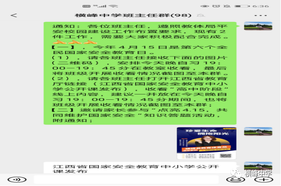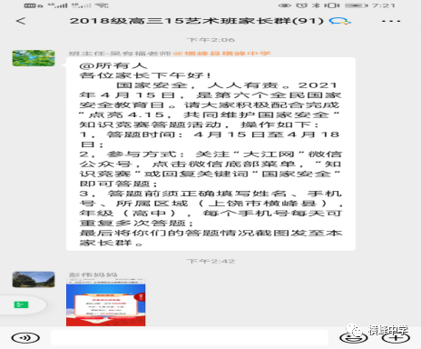 二、线上教育活动,占领安全教育网络基地——通过班主任工作群具体布置两项安全教育工作,组织开展国家安全知识竞赛