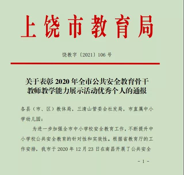 9月6日,上饶市教育局下发《关于表彰2020年全市公共安全教育骨干 教师教学能力展示活动优秀个人的通报》,我校胡雅丽老师荣获2020 年上饶市公共安全教育骨干教师教学能力展示活动特等奖! 特此报喜! 横峰中学