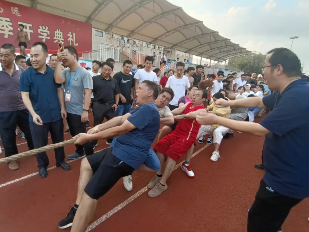 随着我校党委书记、校长苏万林的一声令下,大家齐心协力、拧成一股绳,每一位队员都把自己全身的力量贯注于拔河绳上,每一个人的心也同时被紧紧地系在了一起,一心为年级荣誉系在了一起,一心为团队荣誉而顽强拼搏。一张张脸涨得通红,一双双脚紧紧挨在一起,身体紧紧地靠着绳子,拼命地往后拉,紧皱双眉,使出了浑身解数。观赛的同学和老师们不断地呐喊助威,声音此起彼伏,气氛热烈而高涨。