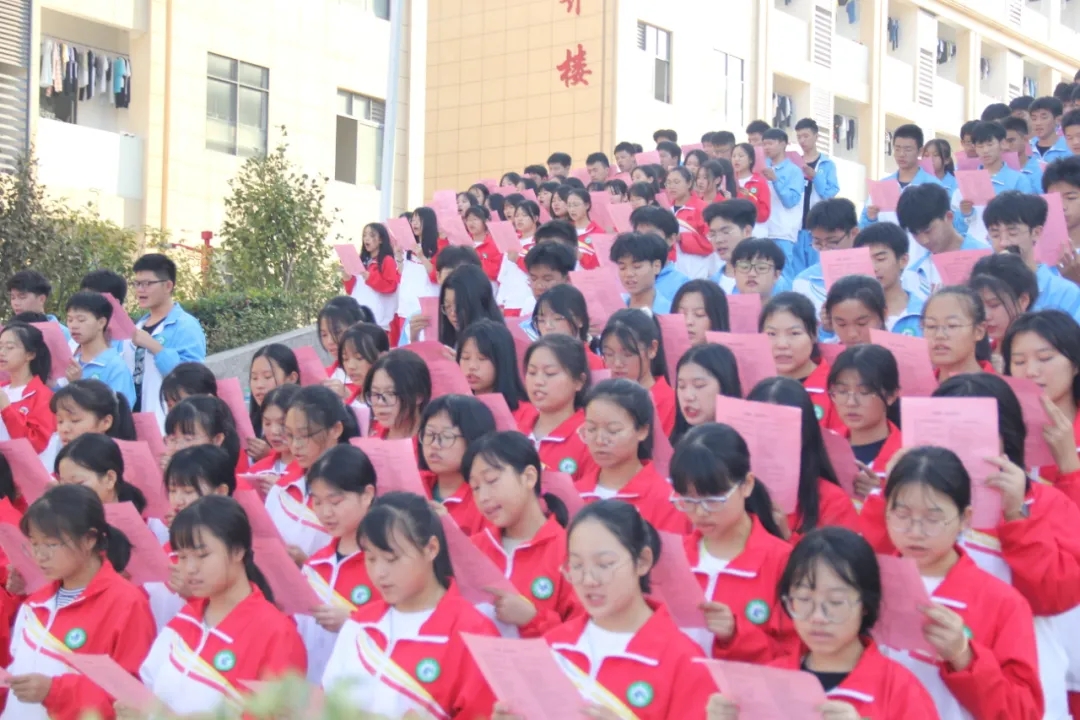 红日初升,其道大光。美哉我少年中国,与天不老!壮哉我中国少年,与国无疆!9月28日上午7点,我校党委书记、校长苏万林携全体班子成员、千余名师生在体育馆前举行“诵唱经典 喜迎华诞”庆国庆爱国诵读活动,大家认真地凝视着手中的诵读稿,仿佛看到了祖国母亲的可爱与慈祥,“我是莫高窟壁画的传人,让那翩翩欲飞的壁画与我们同往。我就是飞天,飞天就是我。我骄傲,我是中国人!” 大家整齐嘹亮地诵读了《可爱的中国》《我骄傲,我是中国人》。万丈豪情拔地起,同学们如空中的艳阳,用自己炙热的心对祖国告白,用激情彭拜的诵读,向祖国深情表白,传递最真挚的爱国情怀。