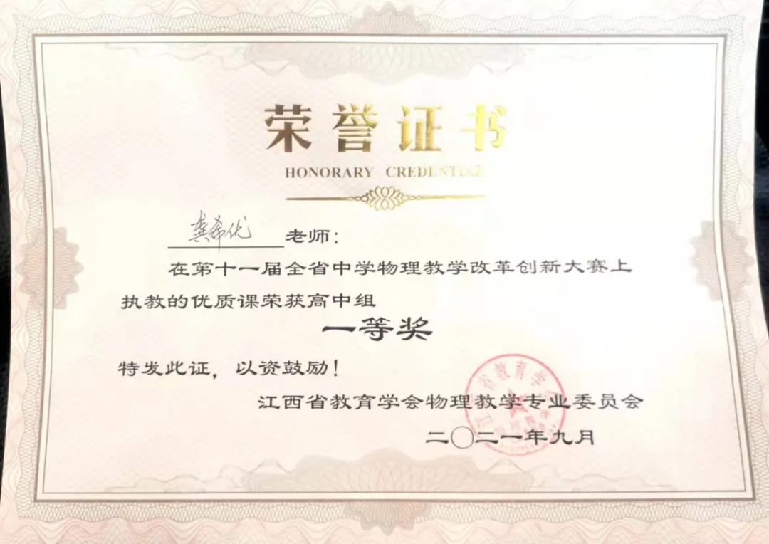 在刚刚结束的第十一届全省中学物理教学改革创新大赛中,我校龚希优老师执教的优质课荣获高中组一等奖! 特此报喜!