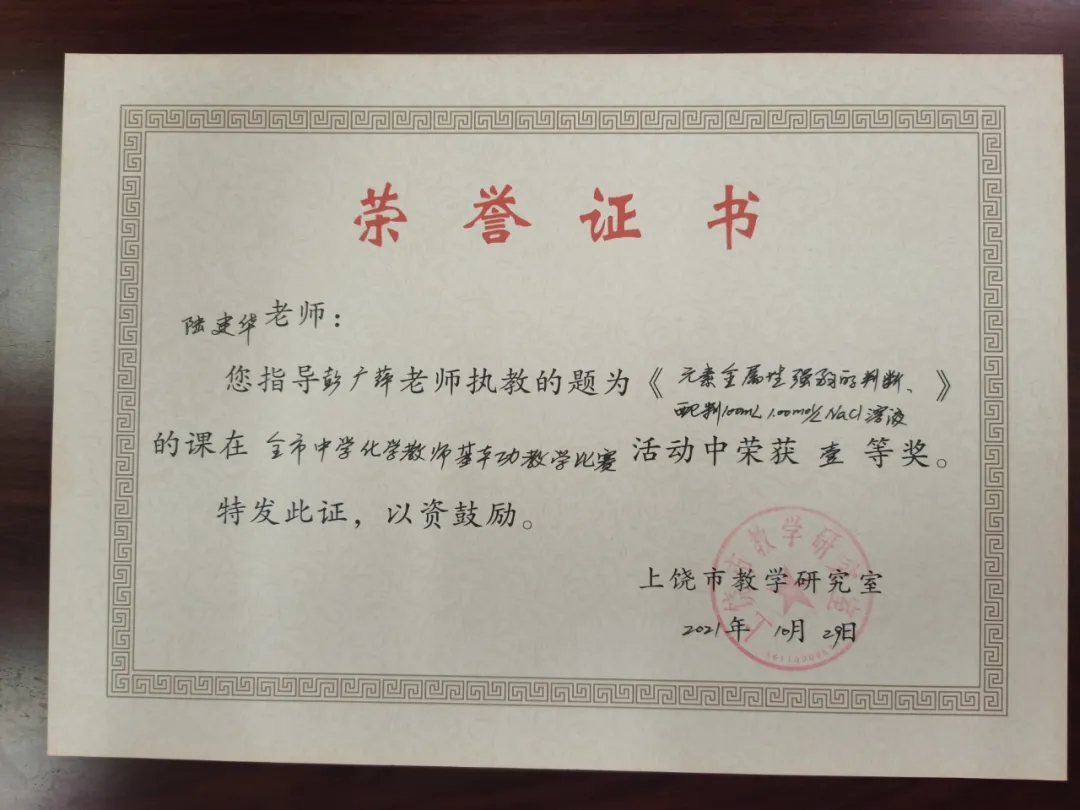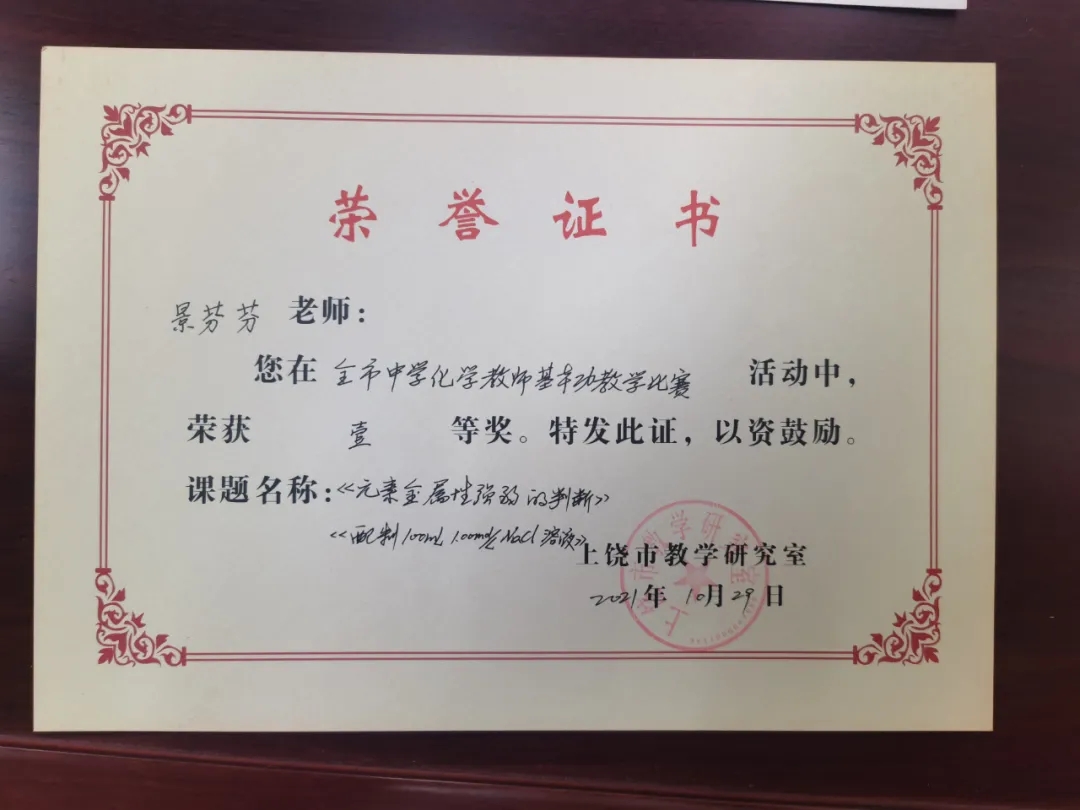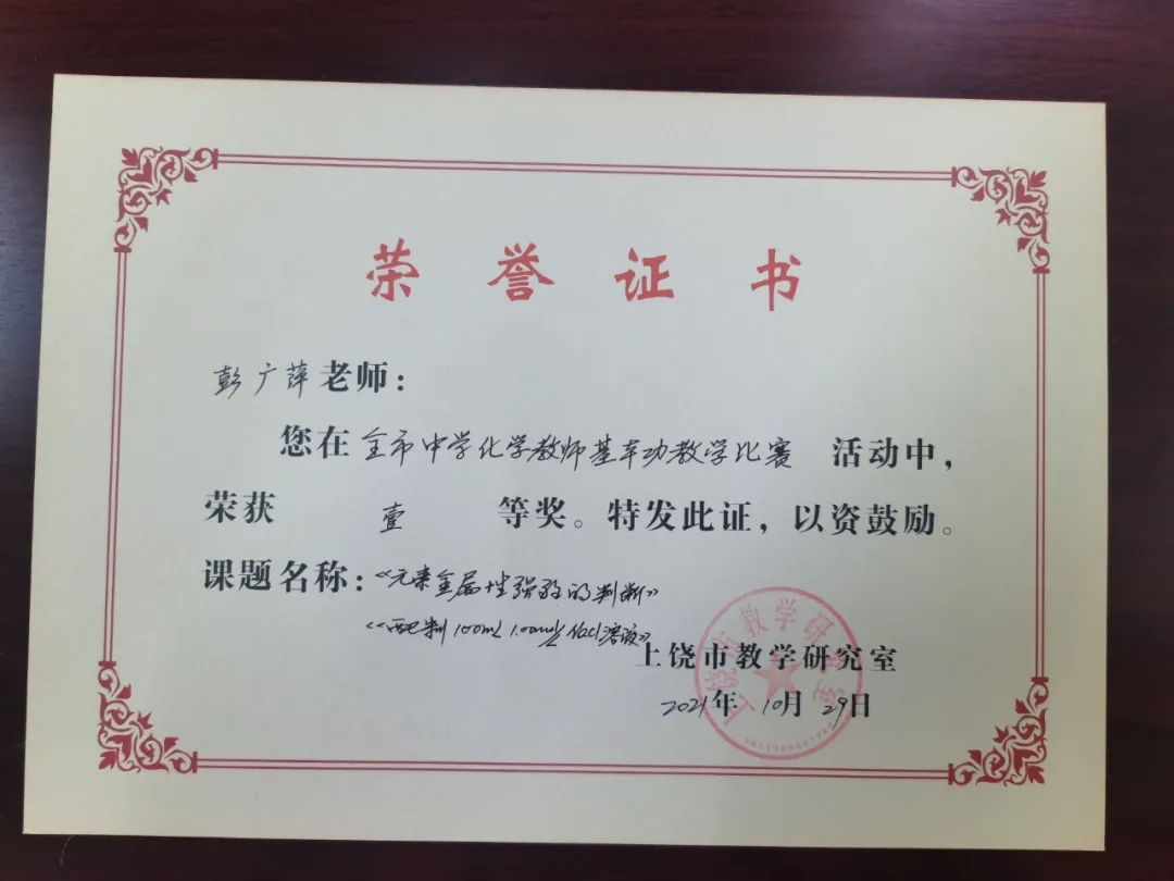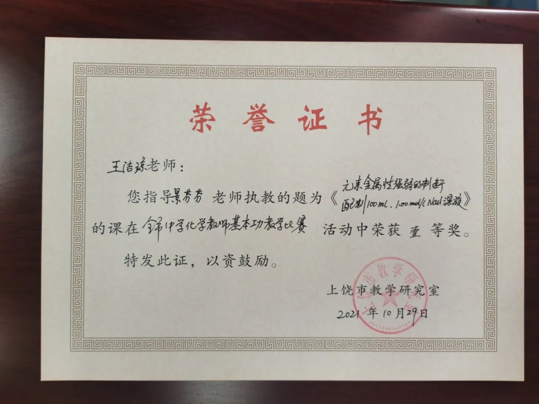 在刚刚结束的2021年上饶市化学教师基本功大赛中,我校景芬芬(指导老师王洁琼)、彭广萍(指导老师陆建华)两位老师均荣获高中组一等奖!
