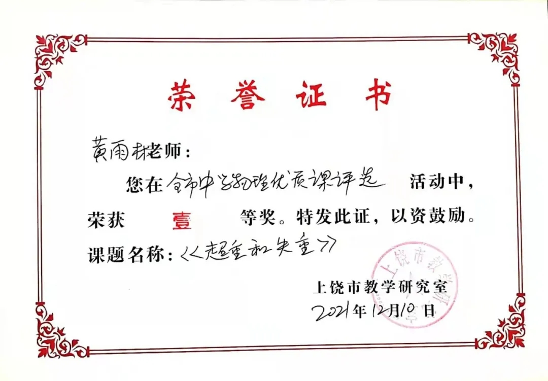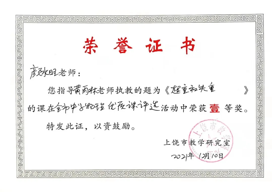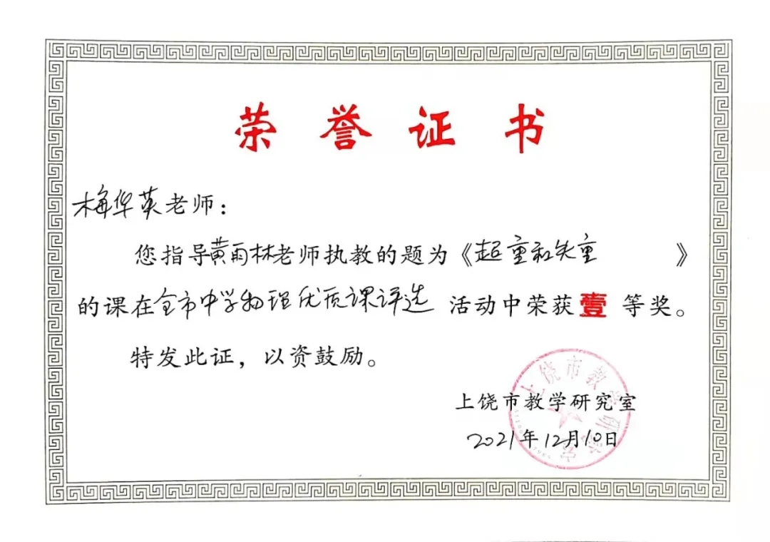 在刚刚结束的2021年上饶市中学物理优质课评选活动中,我校黄雨林(指导老师梅华英、颜水旺)老师荣获一等奖!