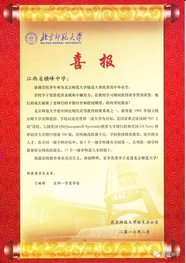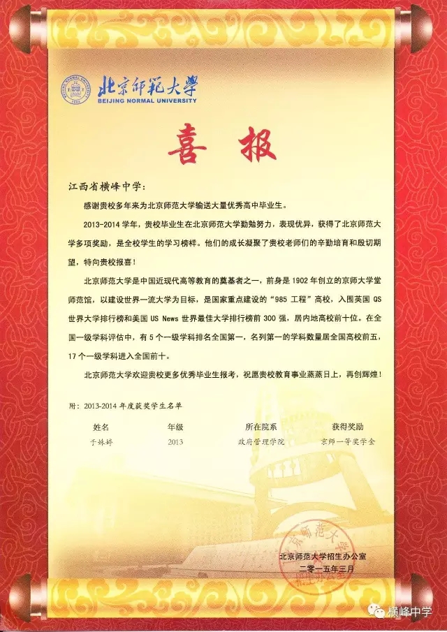 近日,学校收到了来自北京师范大学的喜报,我校2013届毕业生于姝婷在校期间勤勉努力,荣获北京师范大学一等奖学金,在学校整理近来收到的喜报准备归档时,发现于姝婷同学已经两次荣获京师一等奖学金,给广大学弟学妹传递了生命不息、奋斗不止的人生正能量! |