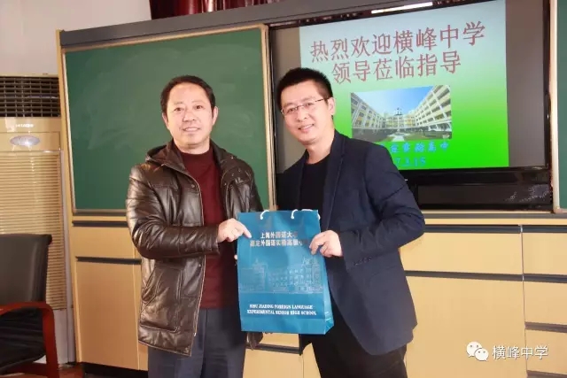 吴冬仔校长及上外嘉定实验学校校级领导早早的在校门口迎接众人的到来,在会议室坐定后,吴校长首先向全体横峰中学教师问好,随后播放了该校的介绍短片和校歌,向来访的老师们介绍了学校的建设和发展情况,在吴校长的介绍下,我们了解到外嘉定实验学校在短短十九年的办学历史中,全校师生发扬“后来居上”的学校精神,努力打造“外语见长,文理并举,全面发展”的办学特色,现在已基本建成适应学生发展的教育教学工作框架,不同兴趣、不同潜能的学生都能找到适合自己的发展空间。学校虽然办学历史短暂,但办学成绩显著。现在,学校综合办学水平已跻身于全市百强高中行列,在吴校长任职的十来年间,学校每年都有超越和突破,高考本科上线率由原来的10%逐步上升到75%左右,学校先后获得了中央教育科学研究所教改先进实验学校,上海市花园单位等荣誉称号。介绍完学校情况后,吴冬仔校长给来访的每位教师赠送了一套该校近几年出版的教育文集。