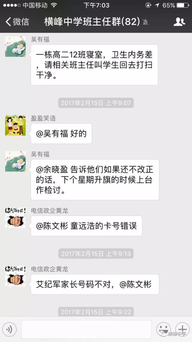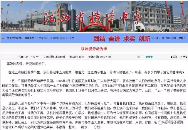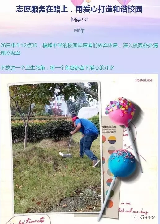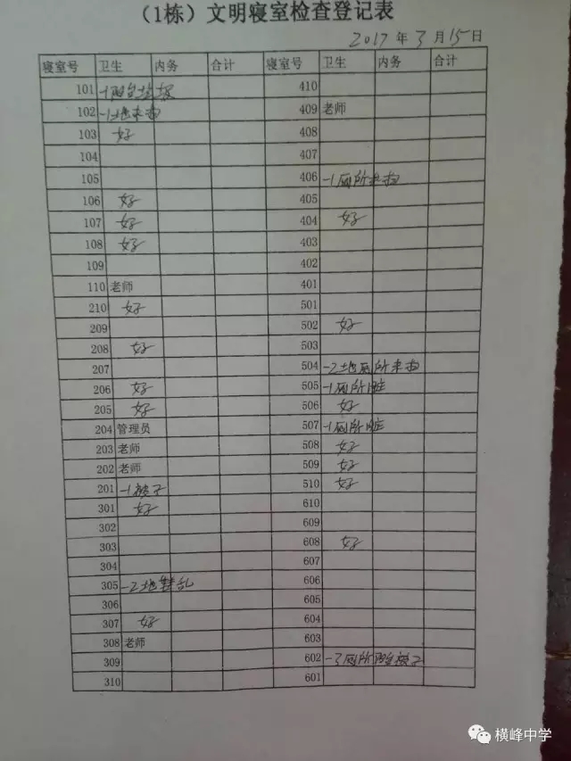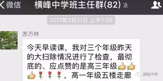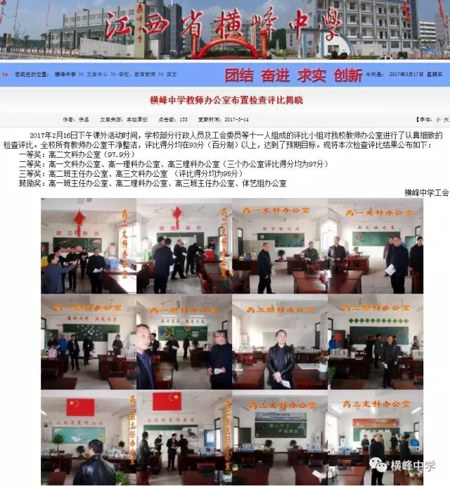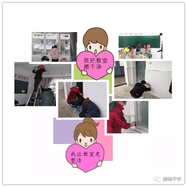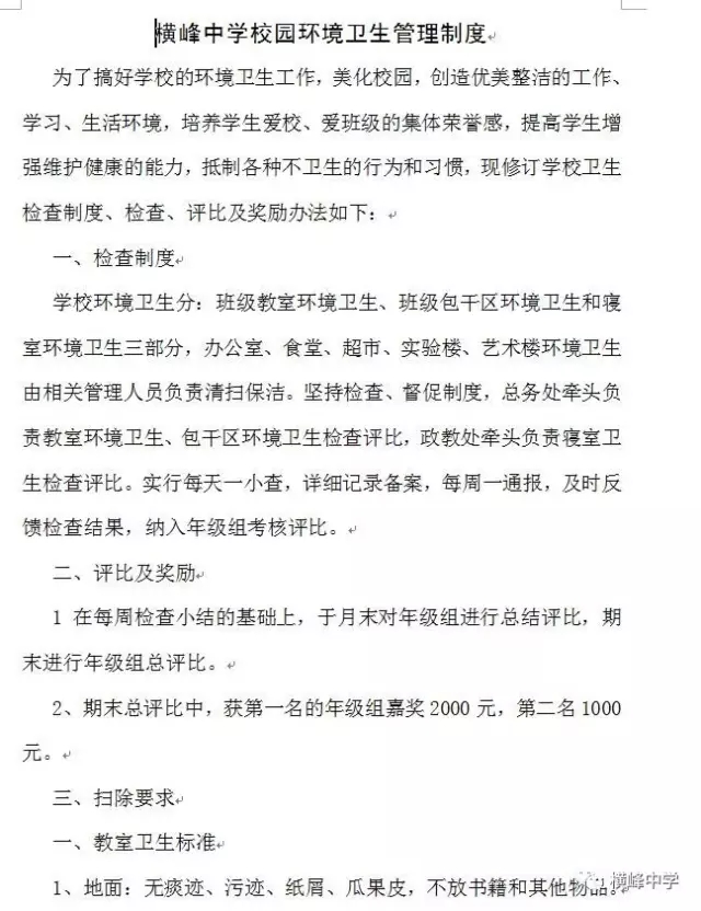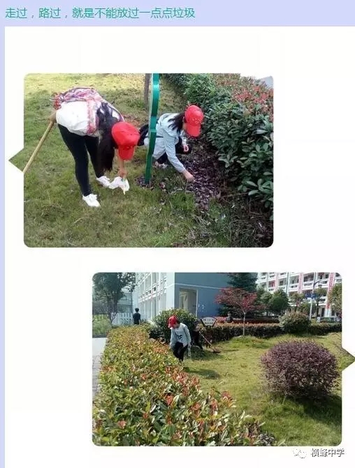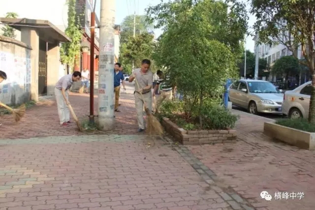 横峰中学党总支书记、校长苏万林每天早早的来到学校,深入各班,对同学们的早读情况和卫生打扫情况进行检查,培养同学们良好的学习和卫生习惯。学校政教部门利用微信群等形式每天及时对寝室卫生检查情况进行通报,并及时通报校园中乱扔纸屑、果壳,随地吐痰等脏、乱、差现象和校园不文明行为,也及时表彰先进寝室和个人,在学校营造出一种人人讲卫生,处处讲文明的良好氛围,劝导学生莫以恶小而为之,带动了校风、学风的不断好转。学校团委利用国旗下讲话向广大师生发出倡议,倡导告别陋习,热爱劳动,做文明使者。团委组建学校环保志愿服务队,派人在校园检查督促,捡拾纸屑、果壳,制止不文明行为。横峰中学一年前就召开了卫生专题会议部署卫生工作,并将工作常态化,成立了以横峰中学党总支书记、校长苏万林为组长的领导小组,领导开展“卫生月”和教师办公室的布置评比活动,组织学校党员、保洁员经常上街开展义务劳动,清除卫生死角,为维护省级卫生县城的荣誉而做出贡献。一直以来,学校以培育良好的卫生习惯为突破口,培养师生良好的卫生行为习惯,弘扬社会主义核心价值观。这一系列活动的开展有效治理了“脏、乱、差”、“庸、懒、疲”等不良习气,培育了积极向上、团结协作、积极进取的团队精神,学校师生一致表示:要保持讲卫生、讲文明的良好习惯,树立环保意识,为保持卫生县城的干净整洁贡献自己的一份力量。“卫生月”等活动的开展也有力促进了优良教风、学风、校风的形成。