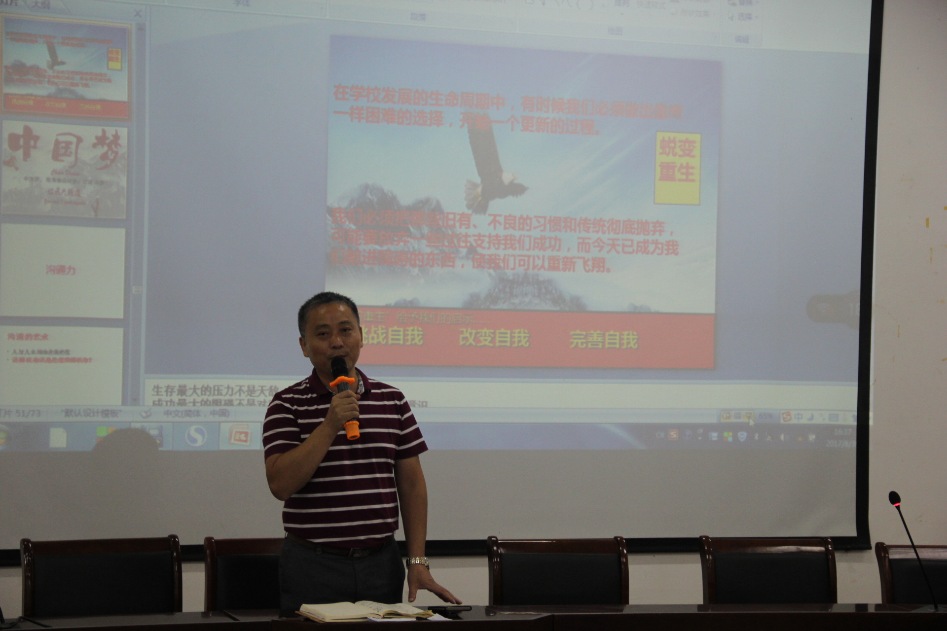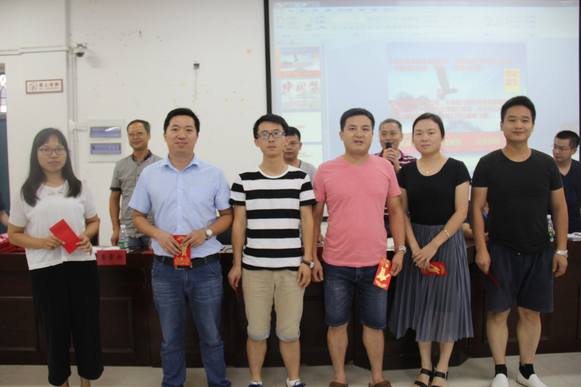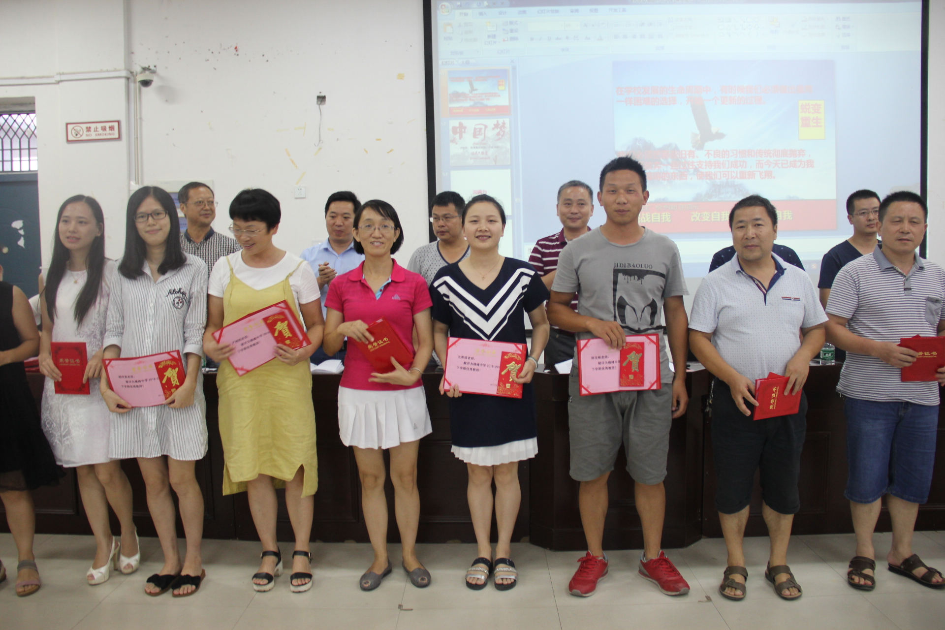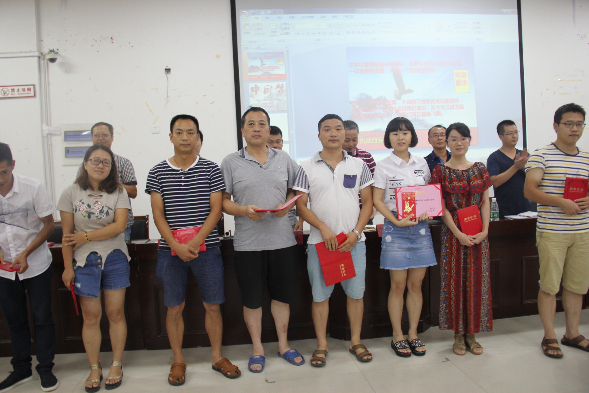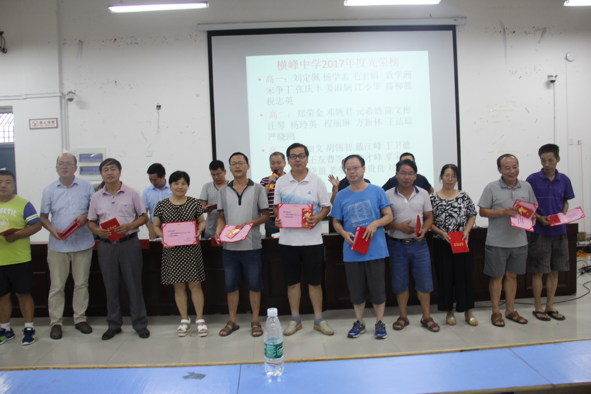 聆听了陈老师两个小时的精彩内容后,短暂休息十分钟,16:30分开始,接着召开了横峰中学2017年全体教职工大会。首先请今年新进老师做自我介绍,随后教务、教研、政教、总务各相关负责人就开学工作做了具体安排,并对“优秀教师”“优秀员工”进行表彰。