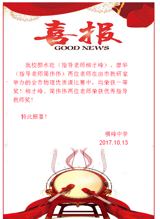| 【喜报】主场作战尽显风采--我校颜水旺、廖华老师荣获全市物理优质课比赛一等奖! | |||
