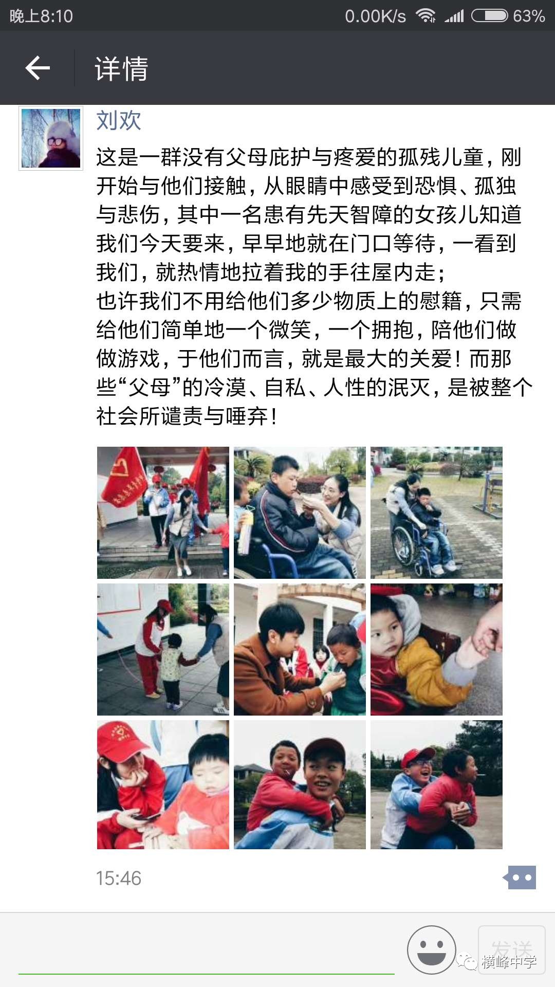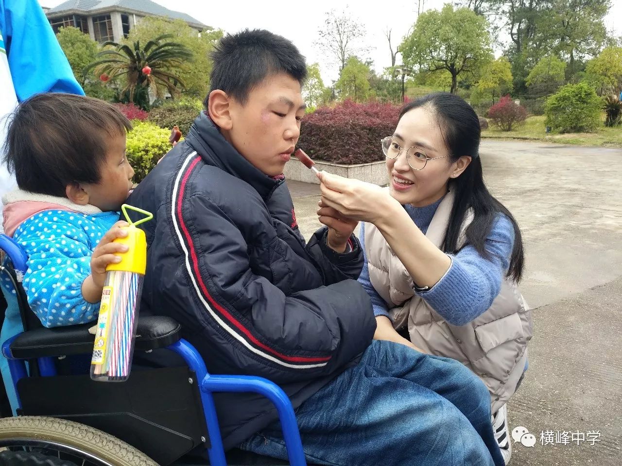 在清理过程中,大家齐心协力,充分发扬不怕脏、不怕累的精神,不放过任何一处卫生死角,此次志愿服务活动,在一定程度上改善了公园环境,同时用行动宣传了“环境保护从我做起”的理念,增强了游客的环保意识。 02 走进福利院 3月18日上午,充满爱心的横峰中学志愿者们在团委副书记刘欢、社团指导老师杨进的带领下,来到横峰县儿童福利院,为孩子们带去温暖和快乐。