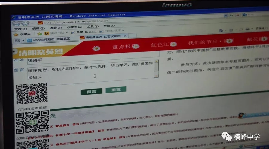 4月4日下午,校团委组织师生开展清明“网上祭英烈”活动。 师生们纷纷登录专题网站,浏览网络上的历史资料和照片,通过发帖和参与讨论等形式,在网页上进行文明祭扫、鞠躬、献花、抒发感言等活动,表达了对革命英烈和当代英雄诚挚的敬意和深深的怀念。这一文明无烟祭扫活动,还吸引县电视台的采访报道。 三、缅怀先烈之信仰的力量---横峰中学2018团日活动