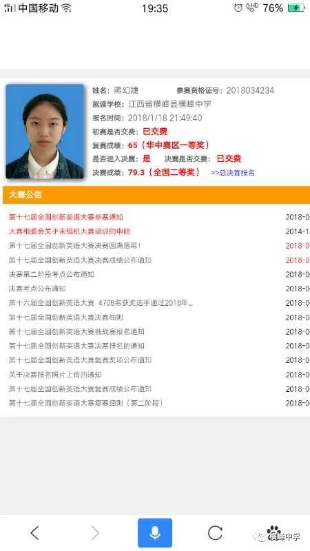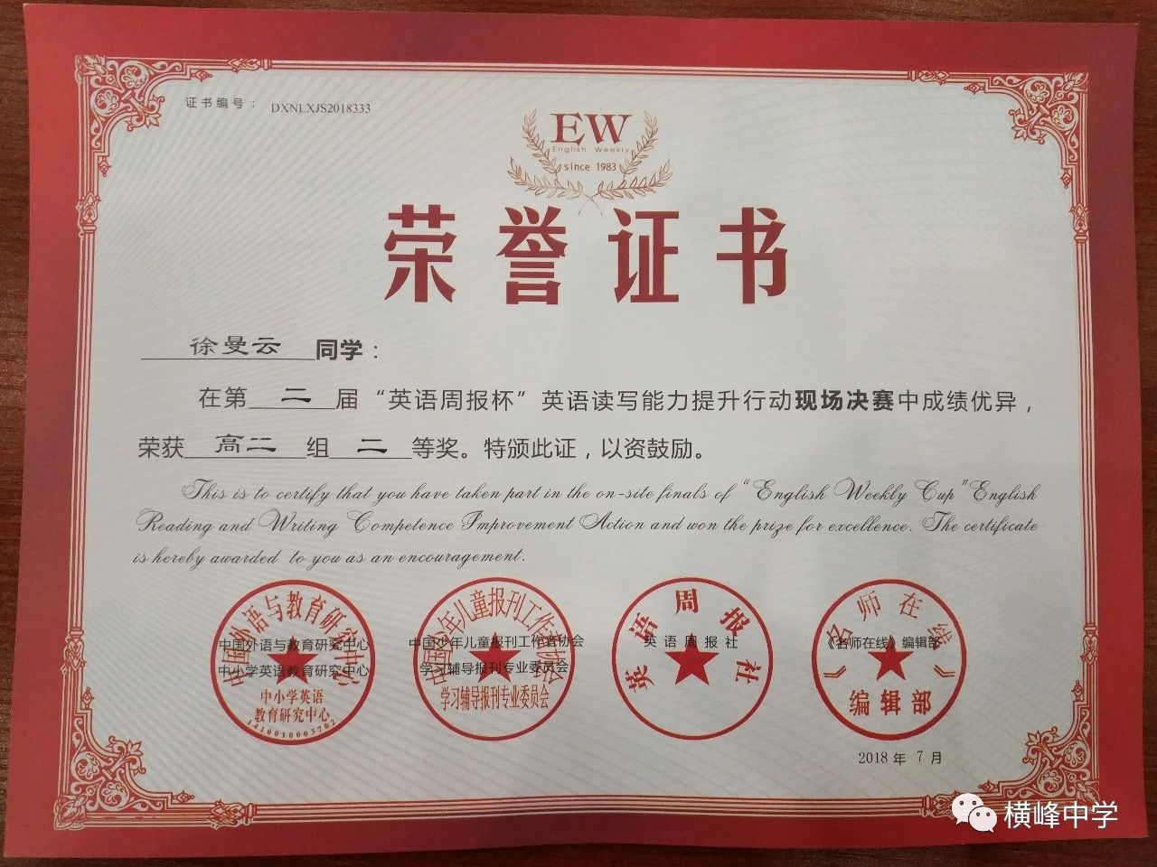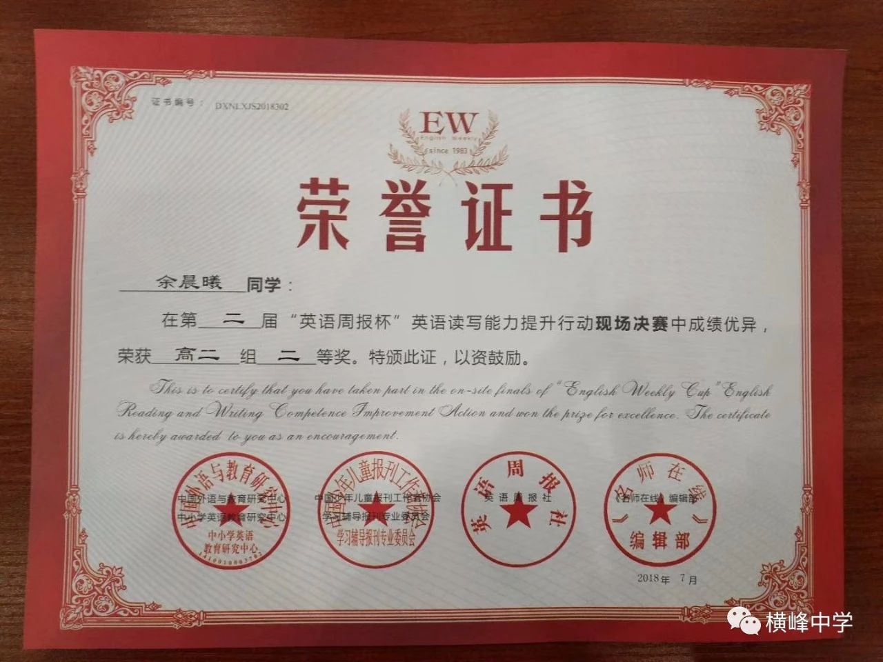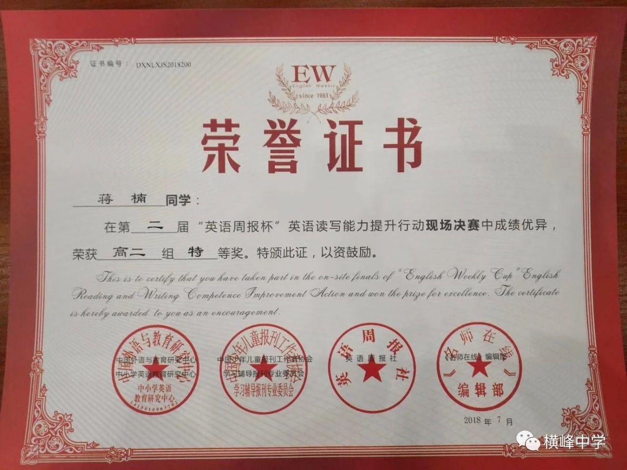 火热七月唱响横中最强音 南征北战谱写师生新辉煌 热烈祝贺我校蒋楠同学在刚刚结束的第二届“英语周报杯”英语读写能力提升现场作文比赛中技压群雄,从全国40万名选手中脱颖而出,荣获特等奖! 热烈祝贺我校徐曼云、余晨曦两位同学荣获第二届“英语周报杯”英语读写能力提升现场作文比赛全国二等奖! 热烈祝贺我校蒋幻婕同学在刚刚结束的第十七届全国创新英语大赛中荣获华中赛区一等奖、全国决赛二等奖! 特此报喜! 横峰中学 2018年7月22日