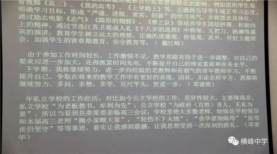 “因材施教,这个‘材’不仅是学生本身这个‘材’,也包括教材的‘材’。”苏校长在讲座上分享了成为好教师的秘密、好教师的概括、教师作用的“二八划分”、高校课堂的三大秘诀、“五步三查”的好课模式等措施。“学校领导和本届高三教师‘抛小家顾大家’、‘轻伤不下火线’、‘舍孕妻别病母’、‘虽母丧仍坚守’等等事迹着实让我感到震撼,让我思想受到一次深刻的洗礼。”在讲座最后,苏校长分享了教师的学期工作总结中的感人内容。他勉励全体教工在新学期共同努力,争取2019年再创辉煌,以更加优异的成绩向全县人民汇报,实现横峰中学五年发展规划描绘的愿景。 |