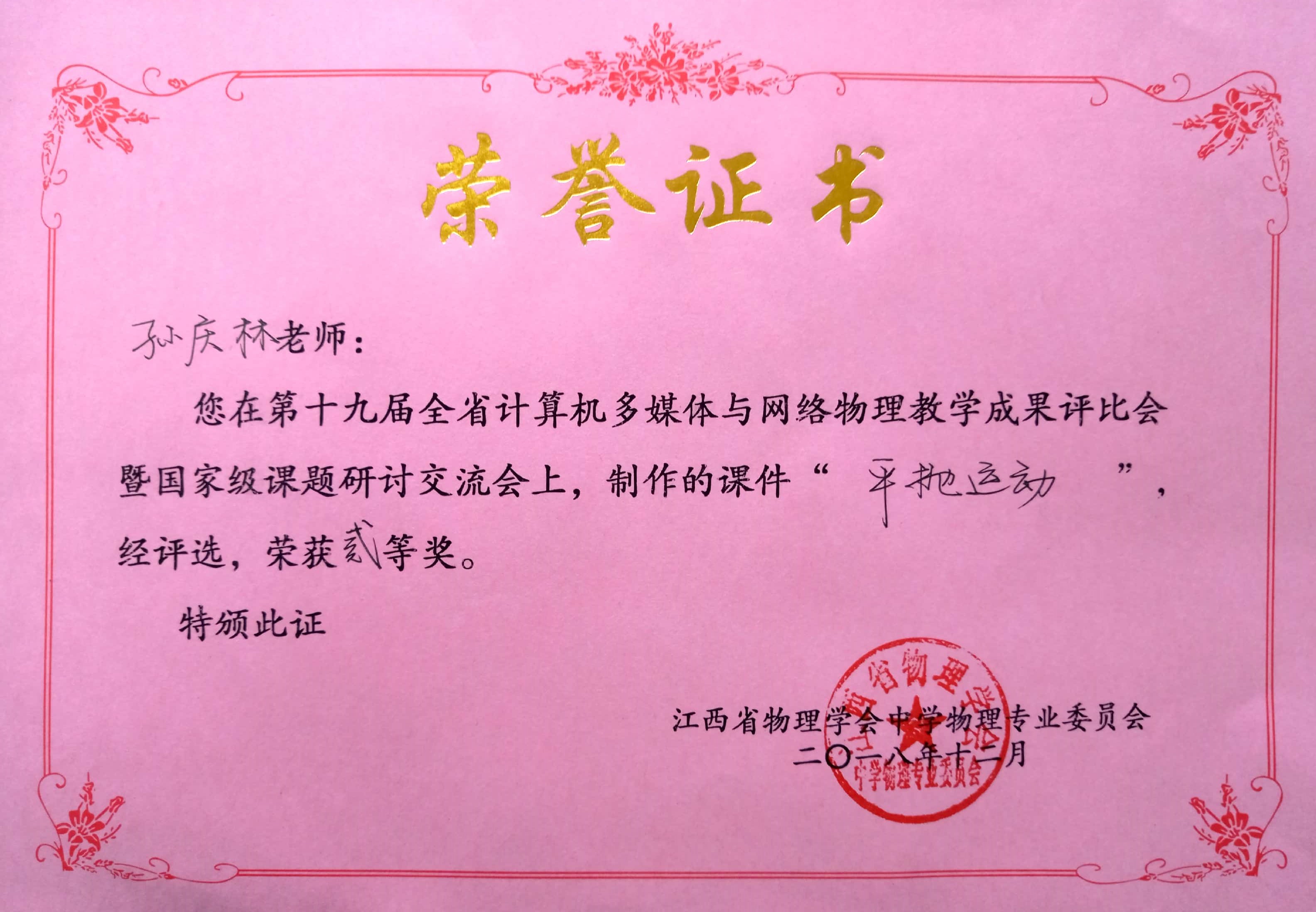 近日,由江西省物理学会中学物理专业委员会举办的全省第十九届计算机多媒体与网络物理教学成果评比结果揭晓,我校有三位教师斩获佳绩: 简伟伟老师 一等奖 孙庆林老师 二等奖 赵振华老师 二等奖 特此报喜!