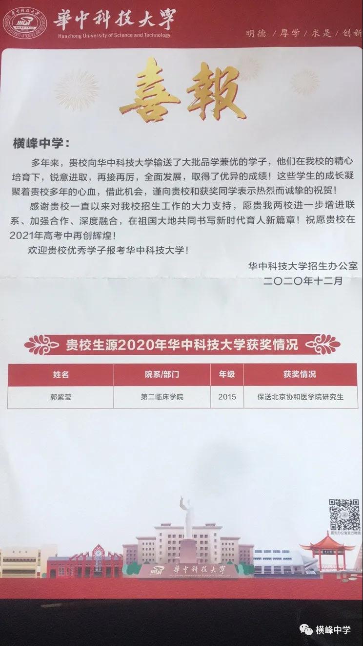 | 近日,华中科技大学向横峰中学发来喜报,祝贺我校2015届毕业生郭紫莹在华中科技大学学习刻苦努力、成绩优异,综合表现突出,被保送北京协和医学院研究生!