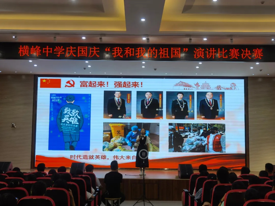金秋十月,有着唱不完的颂歌,金秋十月,有着道不尽的祝贺。在中华人民共和国成立72周年之际,9月27日下午,横峰中学团委在校多功能报告厅举行了庆国庆“我和我的祖国”演讲比赛决赛。经过初赛比拼,有十位同学进入到今天的决赛,能容纳近400人的报告厅今天坐得满满当当,在全场师生的掌声中,现场高潮不断。