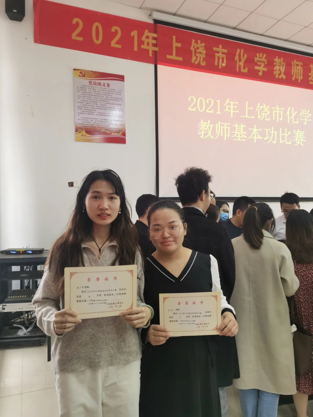 在刚刚结束的2021年上饶市化学教师基本功大赛中,我校景芬芬(指导老师王洁琼)、彭广萍(指导老师陆建华)两位老师均荣获高中组一等奖!