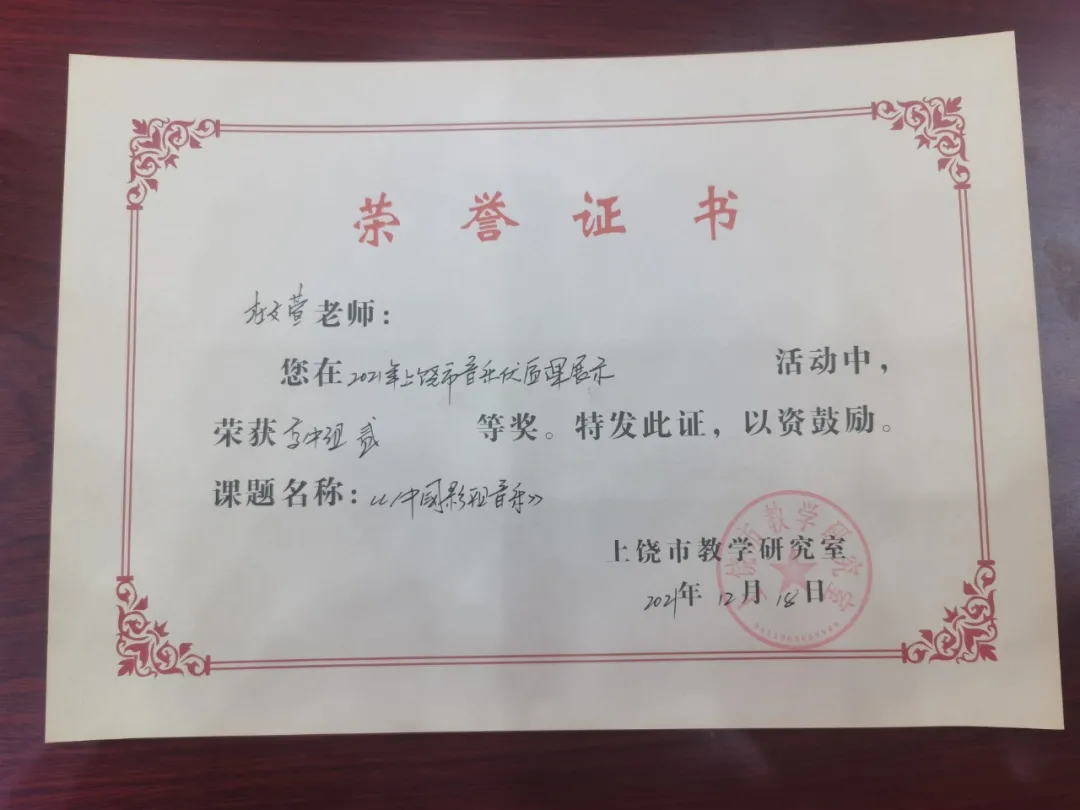 | 横峰中学耿海燕老师荣获上饶市高中音乐优质课展示比赛一等奖!杜文萱老师荣获市二等奖! | |||