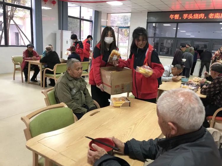 随后在老人的就餐时候,我们志愿者给老人们送上面包,给大家盛饭,陪大伙聊天,欢乐在这里蔓延开来。