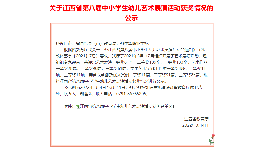 | 近日,我校接到江西省教育厅《关于江西省第八届中小学生幼儿艺术展演活动获奖情况的公示》文件,我校多位教师音乐美育作品喜获江西省第八届中小学幼儿艺术展演活动省级荣誉: 1.声乐类《四季的问候》(指导老师:耿海燕 、琚梦妮、杜文萱)荣获江西省第八届中小学幼儿艺术展演省级二等奖 ! 2.朗诵类节目《青春中国》(指导老师:王月婕、刘俊、程涛文)荣获江西省第八届中小学幼儿艺术展演省级二等奖!