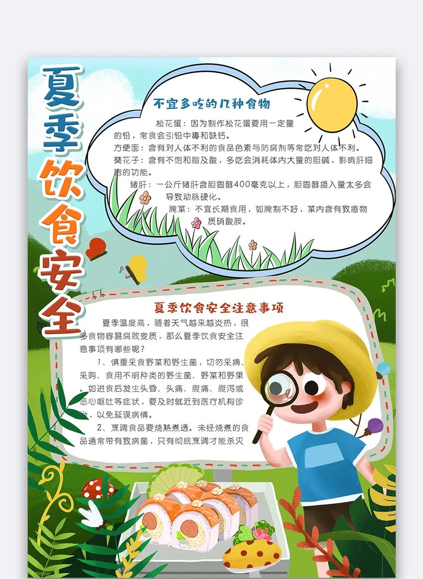 规范使用75%的酒精消毒,切记不可与明火接触。在林区不得使用明火,谨防森林火灾。使用电器、煤气做饭时,家长必须监护和指导;不要让孩子乱动、乱拆、乱接电线、插座和电器设备。 5.饮食安全 夏季天气炎热,食物易变质,细菌易滋生,尽可能选择一些新鲜的食品食用,不吃“三无”食品,不吃生、冷食品,要警惕急性肠道疾病的发生。切勿暴饮暴食,注意荤素搭配,多吃新鲜蔬菜和水果。