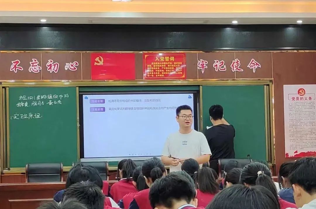 2022年9月22日,在新课程新高考背景下,蔡俊杰老师重视理论联系实际,着眼于培养学生的思维能力和科学探究能力,在高一7班为大家展现了一堂精彩的公开课——《细胞中的元素和化合物》。 蔡老师用一颗人参果打开了课堂,从学生可看可尝的化合物“水”与“糖分”到学生无法直接感觉与接触的化合物“脂肪”与“蛋白质”,同学们带着对“如何检测生物组织中的营养物质”的好奇,开始了新知识的学习。