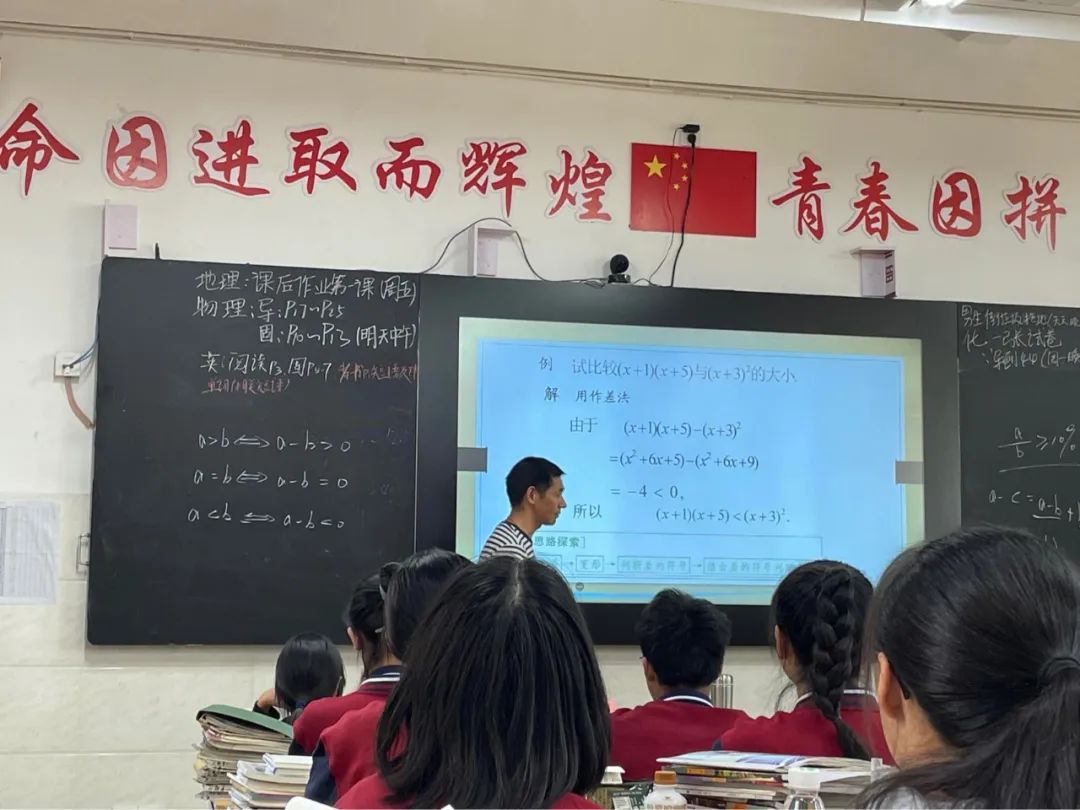 宋老师在教学过程中循循善诱,善于激发学生的发散思维。通过与学生的互动,学生逐步掌握了不等式的基本性质,并运用基本性质比较两个实数的大小,感受证明不等式的基本方法——作差法。 随后,宋老师给出生活实例“民用住宅窗户面积与地板面积的比值应不小于10%”,帮助同学们更好地感受不等式的性质,学生们也积极参与到课堂活动中去。同时,宋老师还带领同学们利用不等式的基本性质,一起用作差法比较两个实数的大小,并归纳总结出作差法的一般步骤,同学们在本节课中获益匪浅。在课堂教学中,宋争丁老师始终坚持教师主导与学生主体相结合,让学生充分发挥自身主观能动性。 最后,宋老师通过生活实例“黄金分割值”巩固新知,并引导学生将课堂上所学的知识应用到实际生活中去,为本节课画上了一个完美的句号。