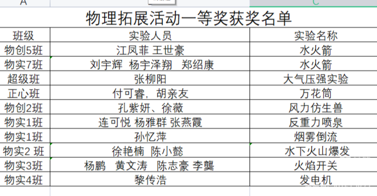 同学们利用身边常见的物品“变废为宝”,让这些普通的塑料瓶展现出它们不普通的作用!既环保又有趣! 加水、组装、充气、发射,一气呵成,火箭以惊人的速度飞向天空,划出一条优美的弧线,同学们的视线都随着火箭移向操场的另一端。那一声声惊叹,给了同学们很大的鼓舞。比赛在一阵阵欢呼声中进行。 下午的实验比赛进行地如火如荼,同学们热情高涨,都十分积极地展现实验成果,也对自己的实验原理进行了详细的解说。 横峰中学物理素质拓展活动获奖名单 |