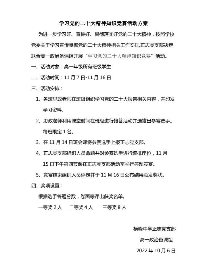 为了让青年团员明白,我们是青年,是中国未来的建设者,肩负着实现中华民族伟大复兴的使命。我们应该高举先辈的伟大旗帜跟紧祖国的步伐,传承红色基因,不忘百年初心砥砺奋进前行,以担负时代为已任,开新局,增新篇!正志党支部联合高一政治备课组于2022年11月15日在正志党支部活动室开展“学习党的二十大知识竞赛”活动。
