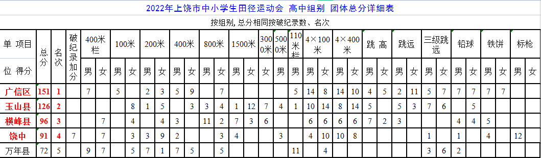 在2022年上饶市中小学生田径比赛中,我校运动健儿奋勇拼搏,荣获全市团体总分第三名,获奖名单如下: 张俊杰:高中男子组800米、1500米双冠 团体总分排名