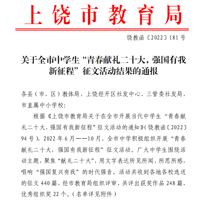 近日,上饶市教育局发布《关于全市中学生“青春献礼二十大,强国有我新征程”征文活动结果的通报》,我校斩获多项荣誉: