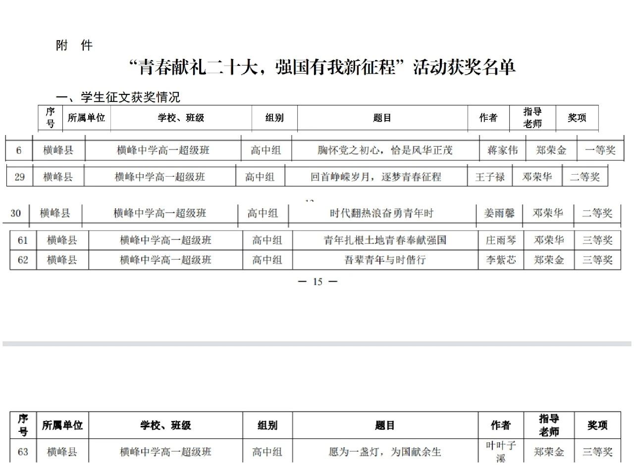 | 【喜报】横峰中学在全市中学生“青春献礼二十大,强国有我新征程”征文活动中斩获多项荣誉! | |||