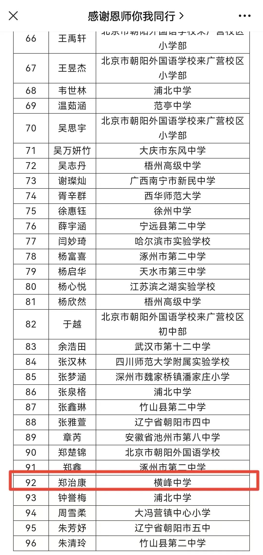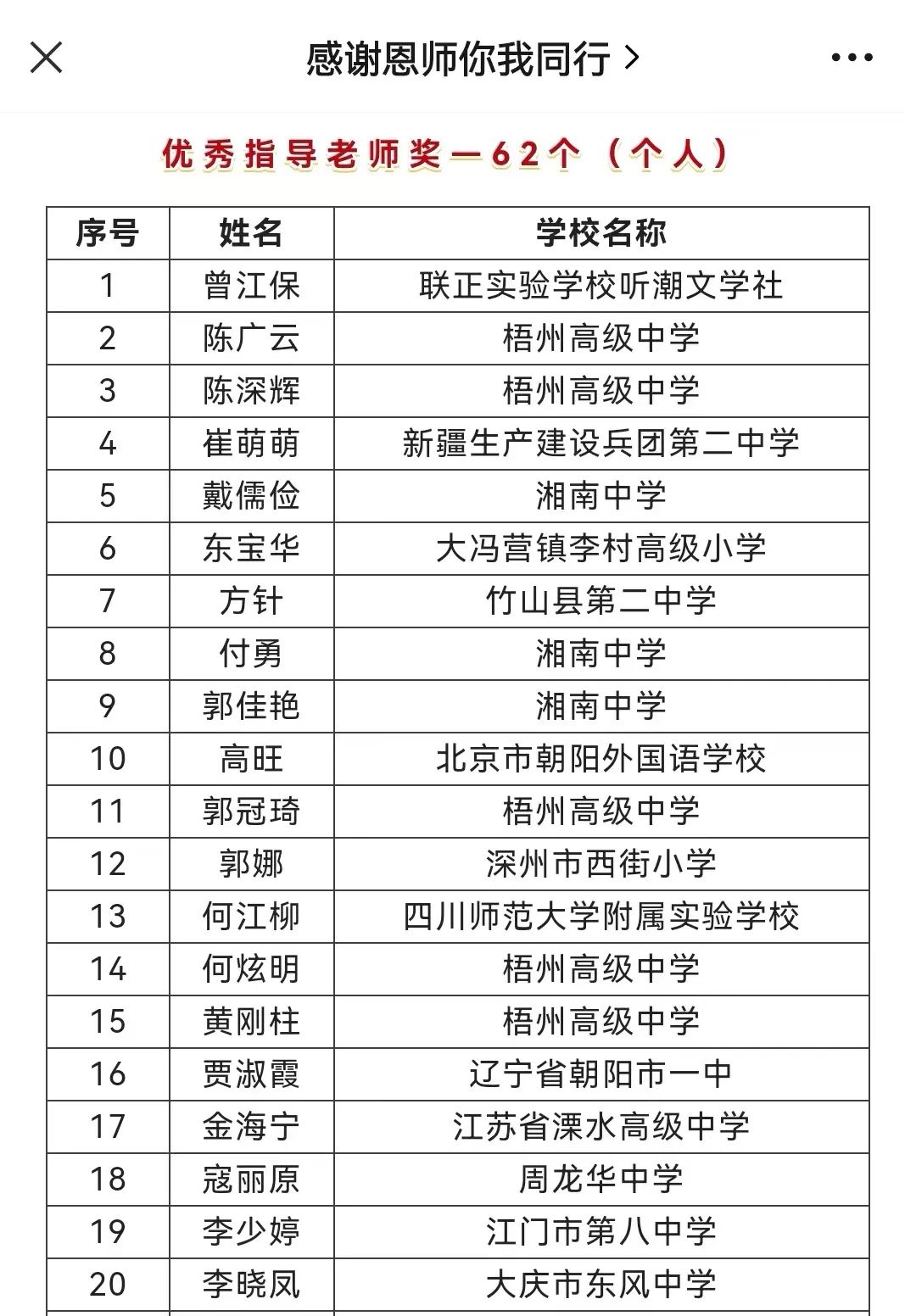 近日,“感谢恩师·你我同行”公布了2022年在教育部教师工作司指导下开展的“为教师亮灯”作品征集活动的评选结果。我校获优秀组织奖,童逸雯、郑小荣老师获优秀指导老师奖,蒋文杰、郑治康同学获优秀征文奖。