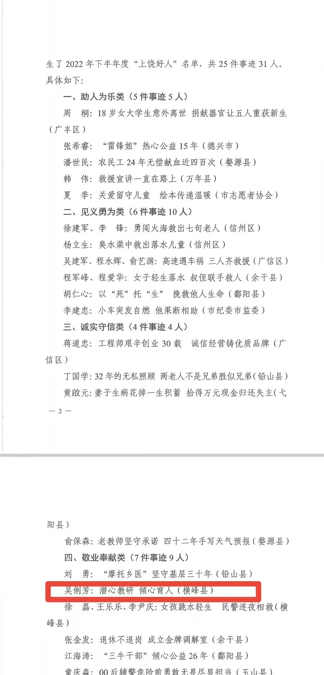 近日,上饶市精神文明建设委员会办公室发布2022年下半年度“上饶好人”入选名单,横峰中学吴俐芳老师荣登“敬业奉献类”榜单,她用实际行动践行了人民教师的无私奉献,赢得了社会的广泛认可!