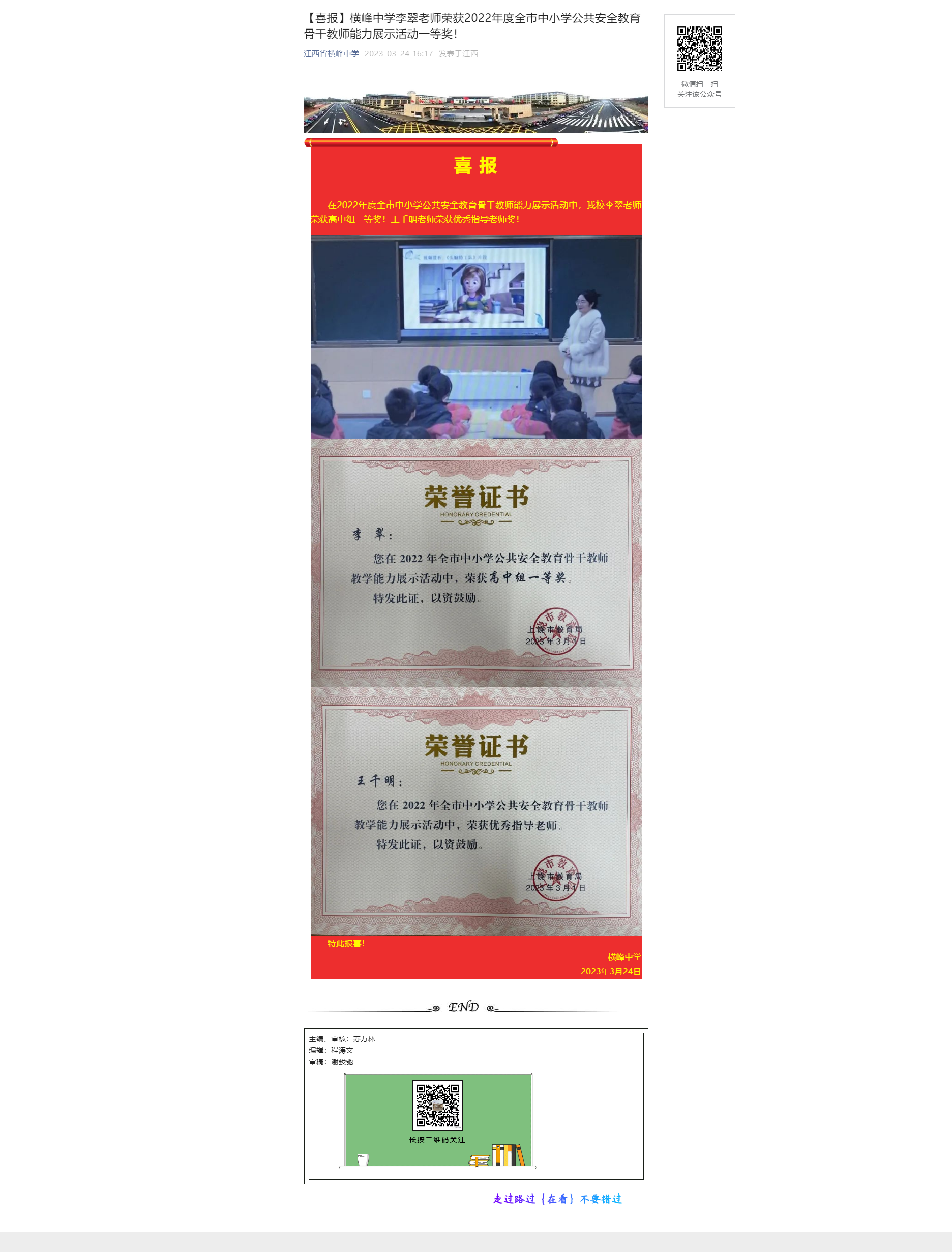 | 【喜报】横峰中学李翠老师荣获2022年度全市中小学公共安全教育骨干教师能力展示活动一等奖! | |||