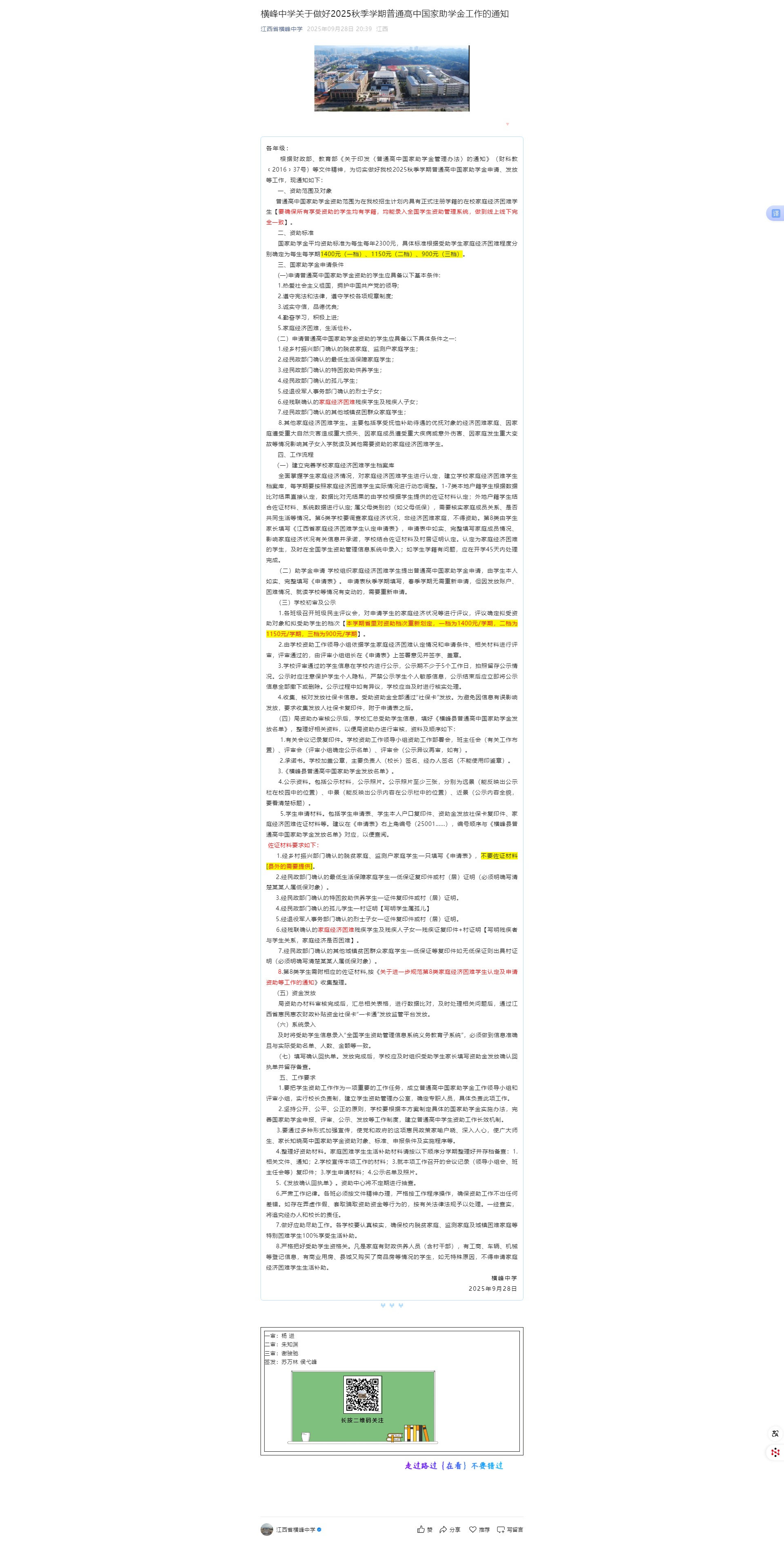 | 横峰中学关于做好2025秋季学期普通高中国家助学金工作的通知 | |||